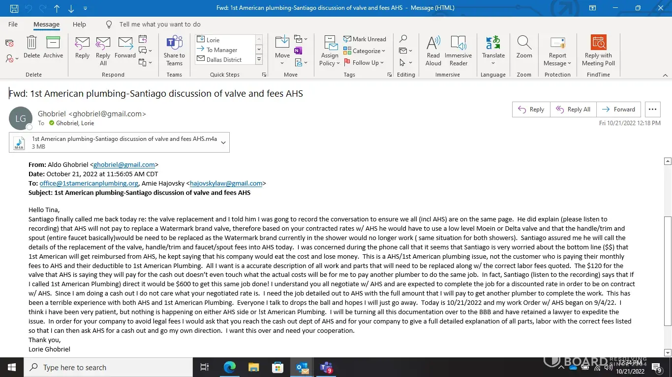 9/7/22 Santiago w/ 1st American plumbing came out & diagnosed 2 shower valves that were no longer working. Santiago explained they would need to be replaced. The brand of faucet is Watermark (currently installed) Santiago explained that he could not replace the valve w/ same brand-Watermark as (AHS) would not approve. He would replace w/ another brand, BUT it would no longer work w/ faucet and that the faucet would have to be replaced in order for the valve to work. As of today I am still sitting with both showers not working and possible mold in my walls! I have been placed on hold for over 70 min and been hung up on several times w/ AHS. For my last 4 phone calls to AHS different representatives (which I now have employee ID #'s) and talking with Tina from 1st American Plumbing several times they claim that the work order was not called in correctly with each item listed in order for AHS to give me the correct amount for a cash out. AHS claims that that only the valve was called in, nothing more. 1st American Plumbing is claiming they have called everything in and that the most AHS will pay them is $114 and they will lose $$. He said if I called them direct w/out AHS they would charge me $600 I have the conversation recorded and plan to share if needed. All I ask is that AHS give me the full cash out for all parts, labor and allow me to end my relationship. I have been patient but am tired of being pushed around by AHS and your contractors.
