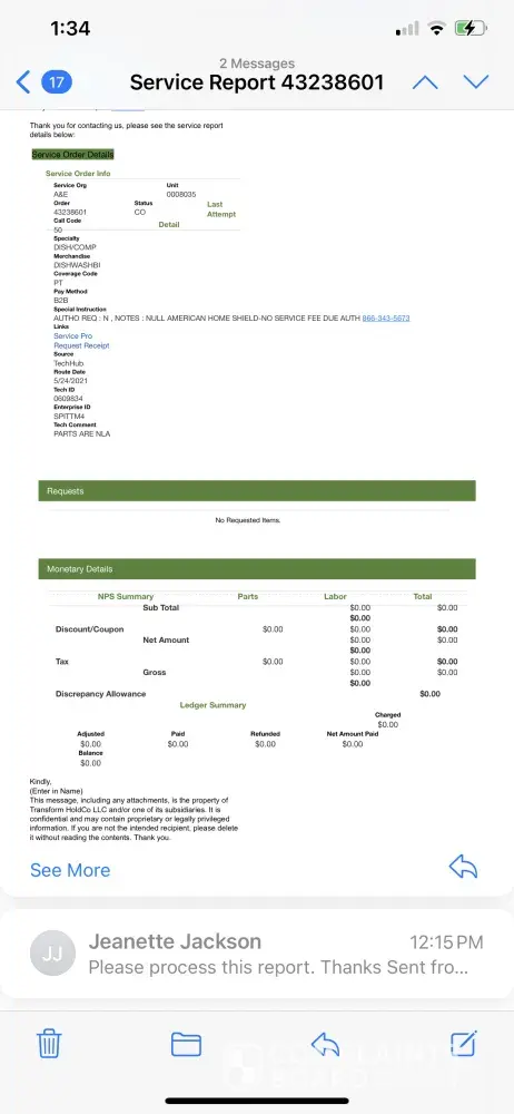 American Home Shield finally approved the parts replacement and told us that the parts were scheduled for delivery on July 3, 2021.