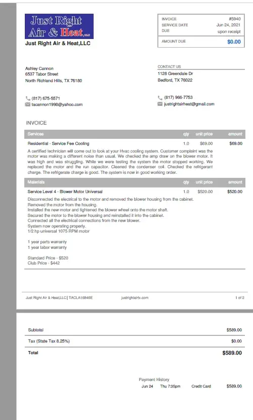 I have been a AHS customer for several years. I have made only several service requests in the entirety of opening my account. The last service request I made, the heating and AC guy came out and I had to pay an additional $350. He stated what he had to do wasn't covered by AHS. He reconnected a vent. The vent wasn't disconnected when he got there… I called AHS to cancel my contract and she said it wasn't up until June. I said DO NOT reinstate me and cancel me then. She assured me she would…(Y'all record all calls, you can verify all this) I got online yesterday thinking this was probably the case, and as I thought, it was not cancelled. So, I put in for a service request on June 24th, 2021, yesterday. The AC company I was assigned to could not get me in for 6 days. My AC was on the verge of going out. I called AHS and talked with an operator re: the long wait time and that I didn't have 6 days with it being 100 degree Texas weather. He told me if I cancelled the request and requested another the outcome would be the same. He never gave me nor told me I could request an outside AC company on my own. I called an AC company and they came 3 hours after my call. While he was working on the AC the motor went out. I called AHS again today and spoke with an operator and she basically told me I was out of luck. That y'all would not refund me ANYTHING. I asked to speak with a manager and she said they were all busy and would call me back. NEVER CALLED BACK. I've attached the Invoice to show his diagnostics and my payment to Just Right Air and Heat. Can you help me with this matter. Ashley Cannon
