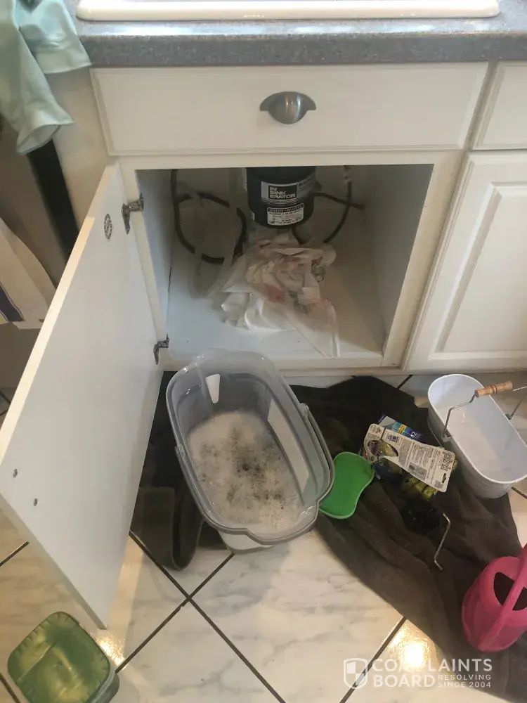 I am writing because this experience has been very distressing and time-consuming and not what I would expect from AHS. I have been unable to use my kitchen since Saturday and the problem has worsened considerably, resulting now in water damage to my kitchen floor, cabinet and personal items that were under the sink. I have done my best to clean up the mess but I know that water damage can have very serious consequences.