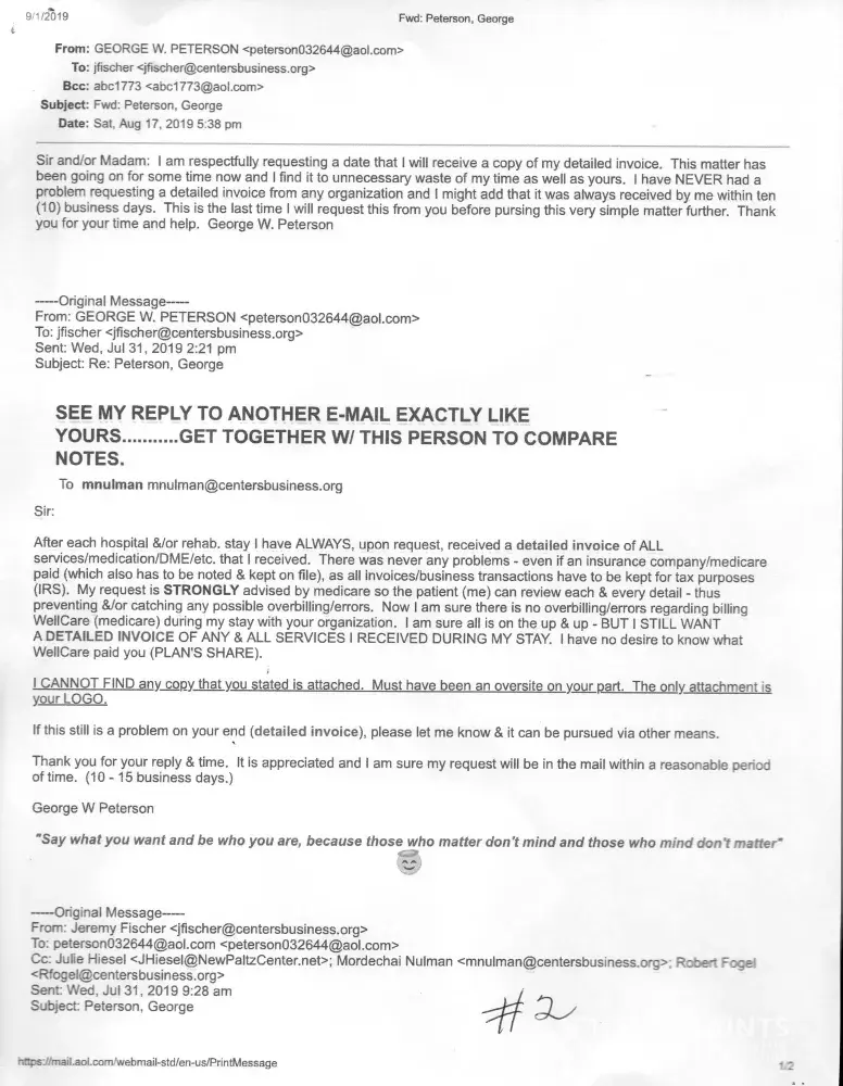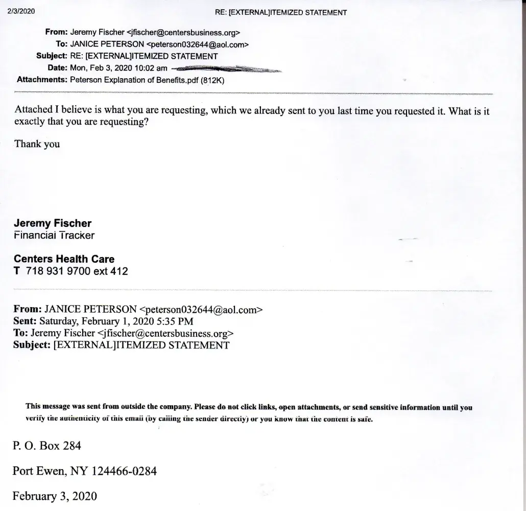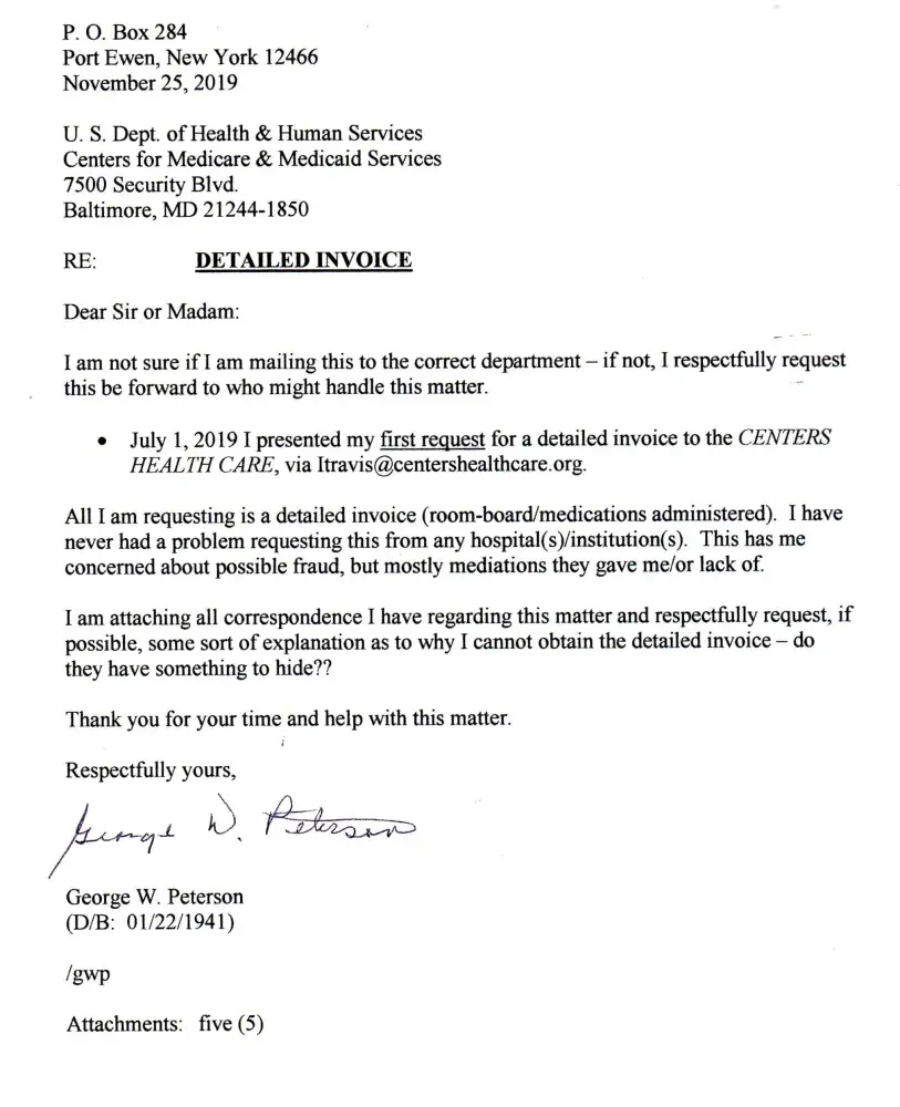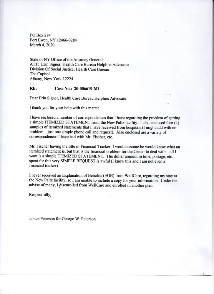 I started requesting an Itemized Statement for my 'stay' at the Centers Health Care [protected] X 412), New Paltz, NY facility in 07/01/2019. I was there 06/04/2019 - 06/18/2019. To date I have NOT received one. Having Medicare (at that time WellCare - I always request the Itemized Statement from a facility I was a patient at, so I may review (a...