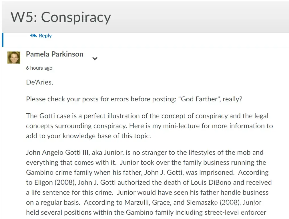 Please reference the attachment where she condescends and demeans a student in the first sentence. The second paragraph is the beginning of her copy paste post that appears on all other students' discussion posts.