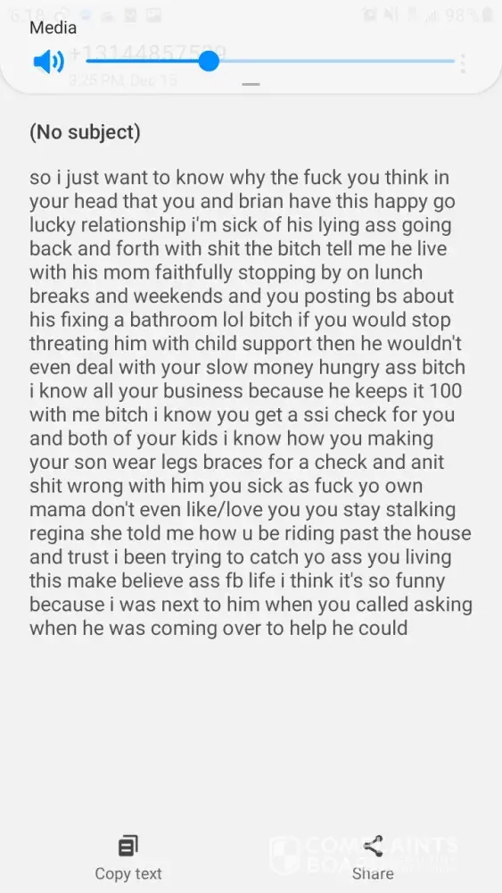 Regina Johnson my son grandmother have been sending disturbing messages to my phone about my disabled child, by her son Brian. Regina and Brian other child's mother Jasmine have been playing on my phone. Brian Foote' and I have broken up over this on going harrassment. I'm not understanding of how a women who works for the community can constantly engage in such negative activities. Regina is a manager at one of the St.Louis Red Cross locations. Just last week she tried to report me for child neglect, while I was in the Hospital. The police came to my home, and after showing proof of my whereabouts the police didn't file a report. I have witnesses of the situation to prove my case.