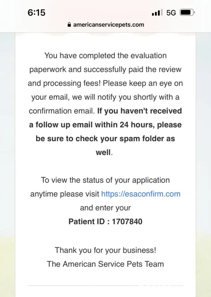 I used them in November . Process was LEGIT and stress free. I started an application online and never submitted it. I was not sure as some reviews have stated. However a rep called me and answered ALL my questions. Also since it is in the ComplaintsBoard.com I gave it a chance. I was able to get all the documents from the Business. Everything did check out and I submitted my documents to the office. This company even got my apartments ESD document signed from the Physician. Over all I would recommend and I will be using their service again. I also got the package with the vest and identification card. Everything came in super fast and the electronic documentation came in within a day of my evaluation. 100% Authentic! Super reliable! The reviews that some post about it being a scam is completely FALSE. I got 2 dogs completed thru American Service Pets with ZERO issues.