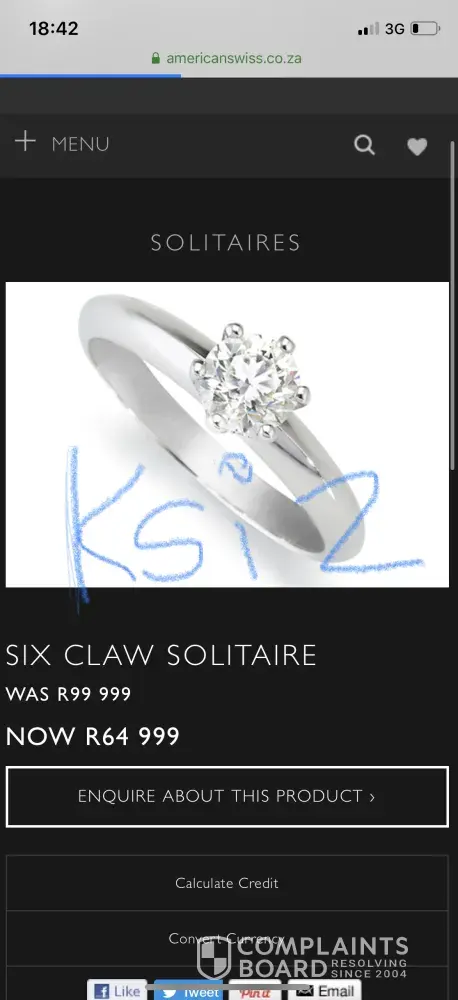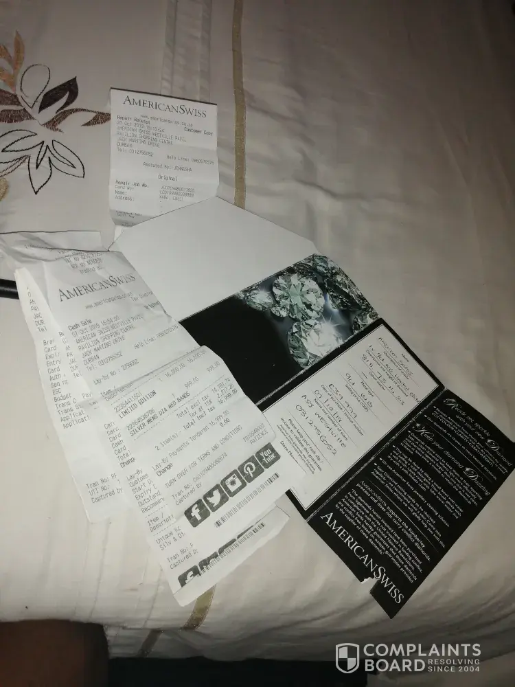 So with that being said, I would like to be refunded the value at which I purchased this ring. I have opted to first communicate this to the head office of American Swiss, which I believe will assist accordingly. If otherwise, I can explore other avenues of consumer dissatisfaction which may tarnish the reputation of the organisation.