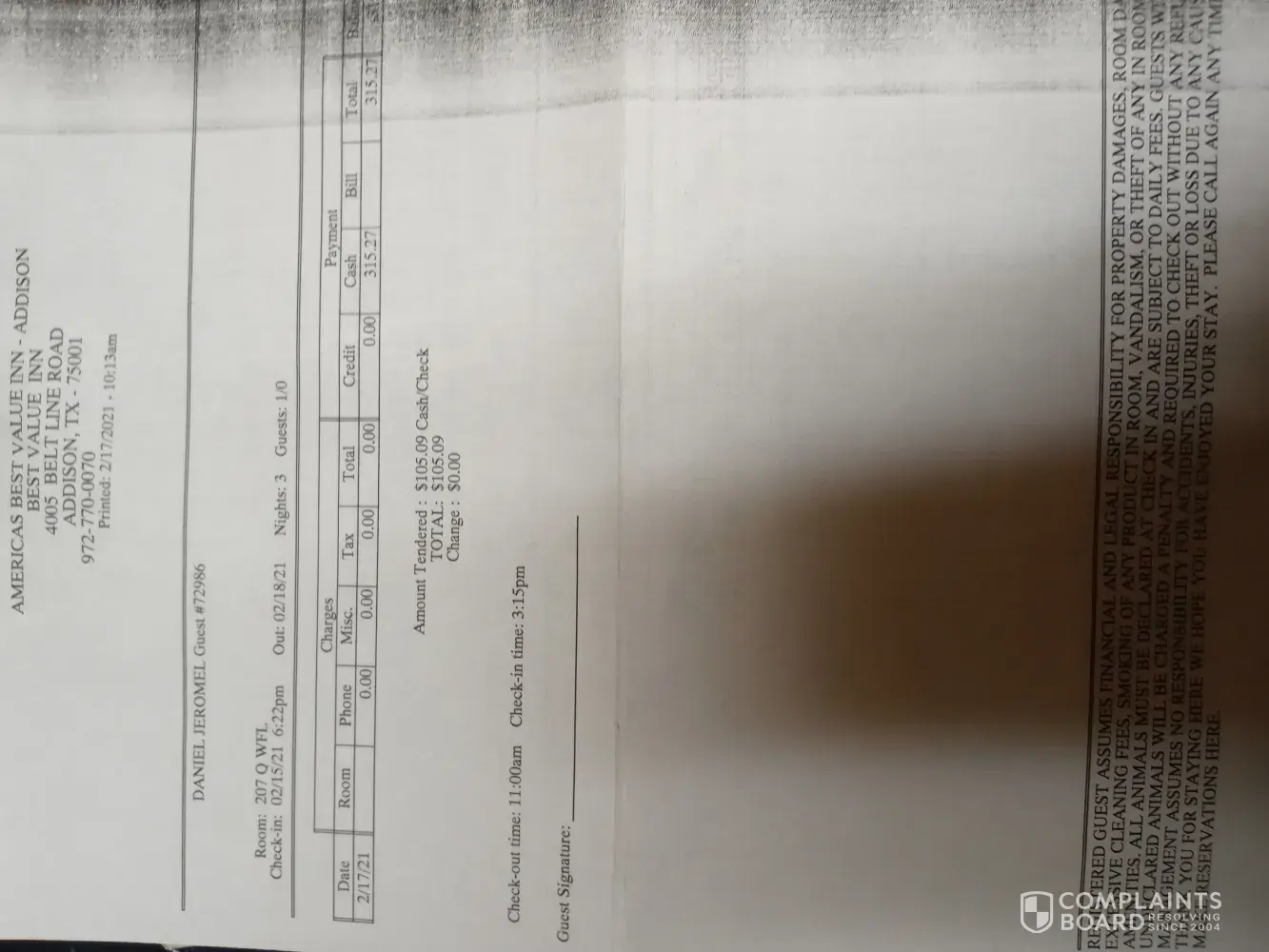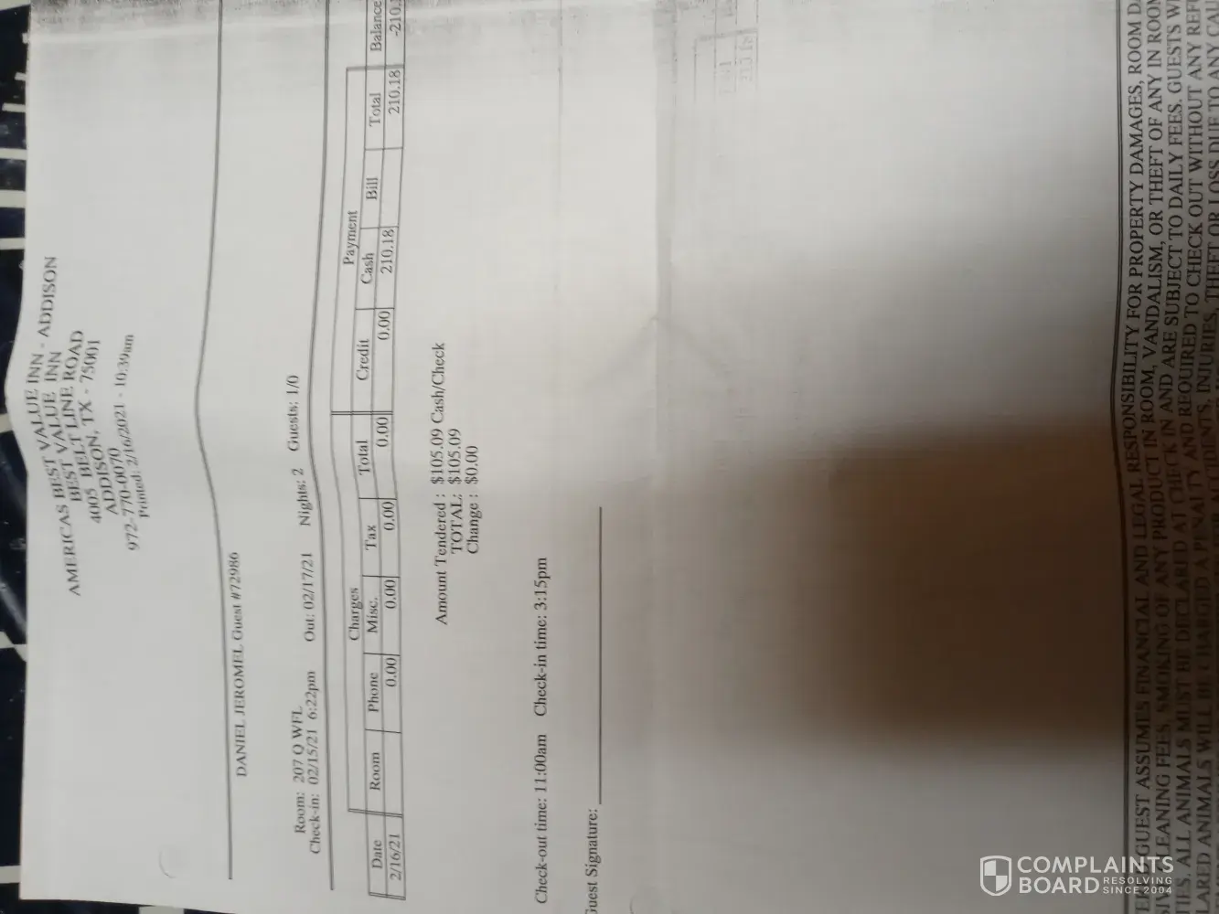 My fiancé and I checked in on Monday [protected] afternoon and checked out Thursday morning 2-18-2021. Due to the power outage in Texas. We could not call in to reserve a room. The front desk asked everyone for (CASH ONLY). We paid $105 a night, we had to stay 3 nights. Total $315.27. We feel like we was racially profiling against as well as other people...