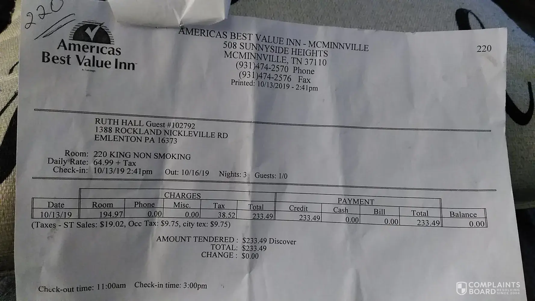 On October 13 th, 2019i walked in the America's Best Value Inn in McMinnville TN. I payed for three nights with my Discover Card. I still have my receipt.. it came to $233.49..64.99 + tax a night.. I finished my business a day early so the night before I told a lady behind the counter I was leaving a day early... very early and to leave a note for them the...
