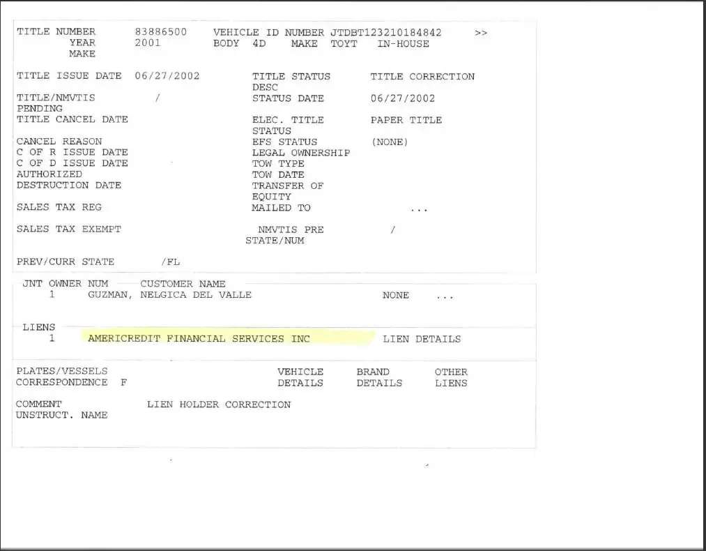 On June 27, 2002, I purchased a car from Southeast Toyota, identified as vehicle number JTDBT123210184842, financed through Americredit Financial Services Inc. loan number: [protected]. The loan was for 6 years which would have completed cycle in May 2008; however, during the year of 2004, Port Saint Lucie Florida, which is where I resided, went through two hurricanes as a consequence three payment were allowed to be placed at the end of the loan term.