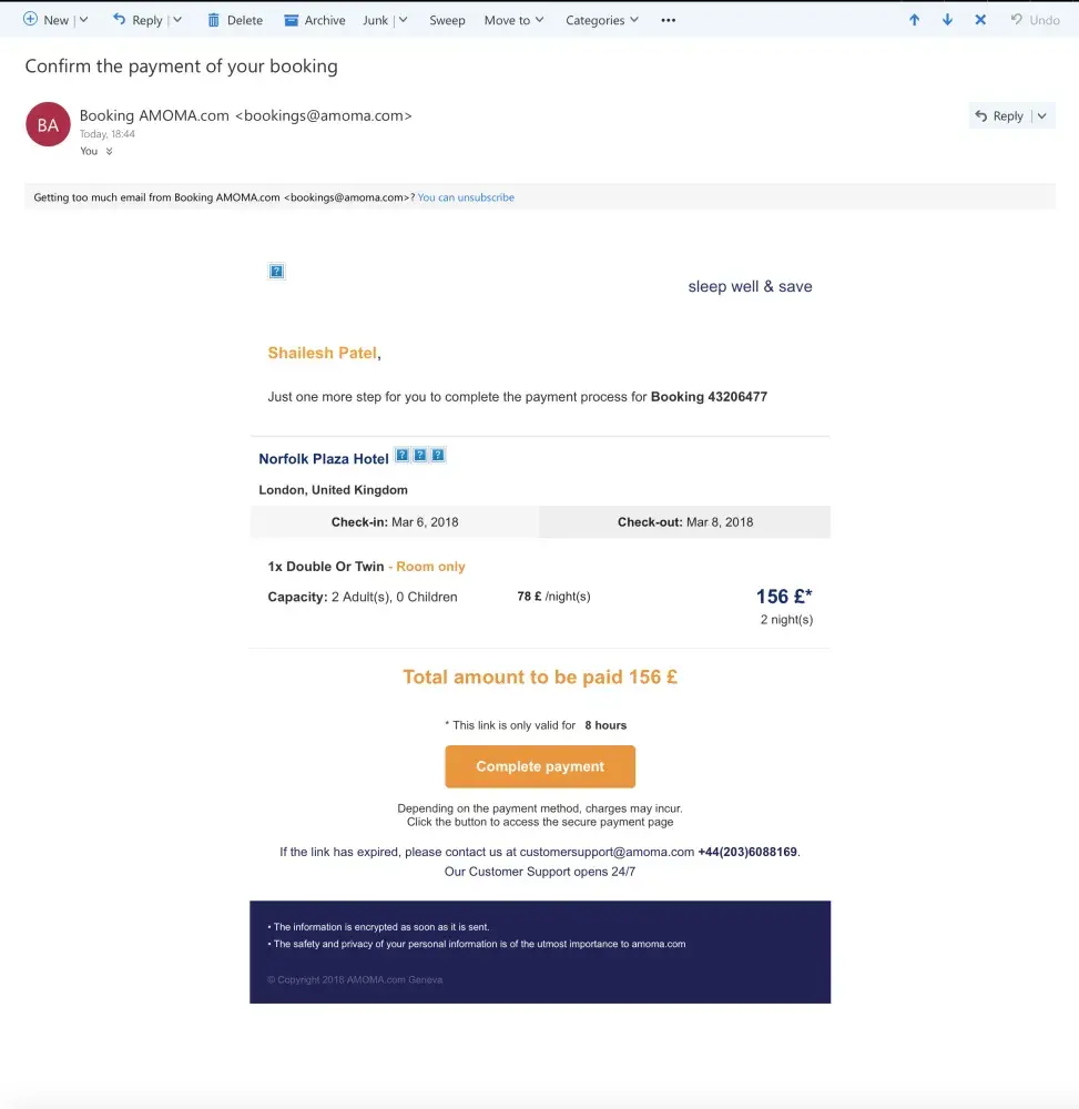 On December 11th 2017, I made a Hotel Booking for a date in September 2018 via the amoma.com website. It was while I was browsing the site that a representative from amoma.com had called me and said that I should book the hotel as they offered a full refund policy on this particular booking up to 7 days before the booking. Thinking I had nothing to lose, I went ahead with the booking, paying £265.71 on my credit card.