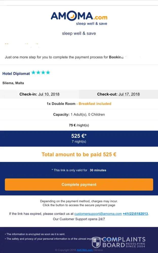 I was booking an hotel in Malta, and I had chosen a Double Room for the price of 525EUR. I input the credit card details and confirmed, and got an email saying "Your reservation for the Double Room is almost completed, please input the credit card details again". I contacted the bank and found out that the payment was processed and my money was taken. So, I had paid but I did not have a confirmation email of the booking.