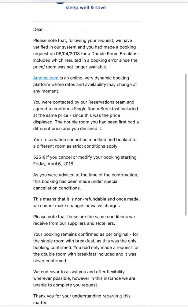 a) – Your booking will become confirmed and final only after receipt of your payment and confirmation is sent by us via an email with your hotel voucher. The booking will be considered confirmed at the time and date AMOMA.com send you the confirmation. However, in the event of a request for booking, our Customer Support team will process your request and your booking will only be confirmed upon receipt of a confirmation and voucher by email from our Customer Support team." So, how can anyone possibly alter a booking because after you've paid and booking is confirmed, you can't cancel it without it costing you the full amount!