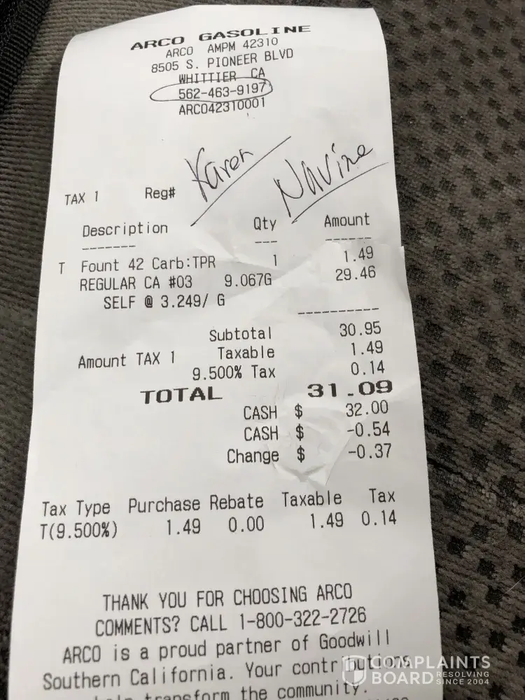 Need to contact the owner of an Arco Station regarding there belligerent attendant. Trying to do the right thing and basic math. $160-12 =48 - 99 = 49.
