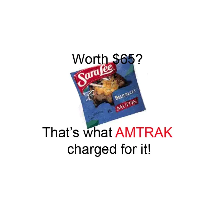 When I reached my room that night, I checked my bank account to verify the amount I would have for shopping the next night. To my surprise I noticed a $65 transaction from the Amtrak Cafe! I was shocked. I had purchased my ticket more than a month ago, and hadn't charged anything else at/on Amtrak that day, so I knew the charge had to be for my muffin.