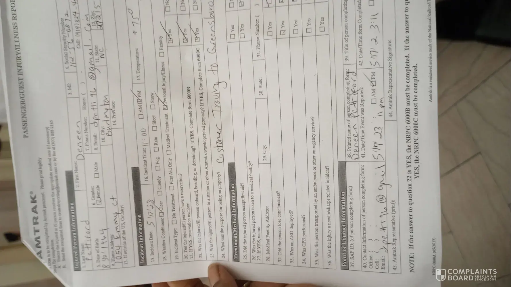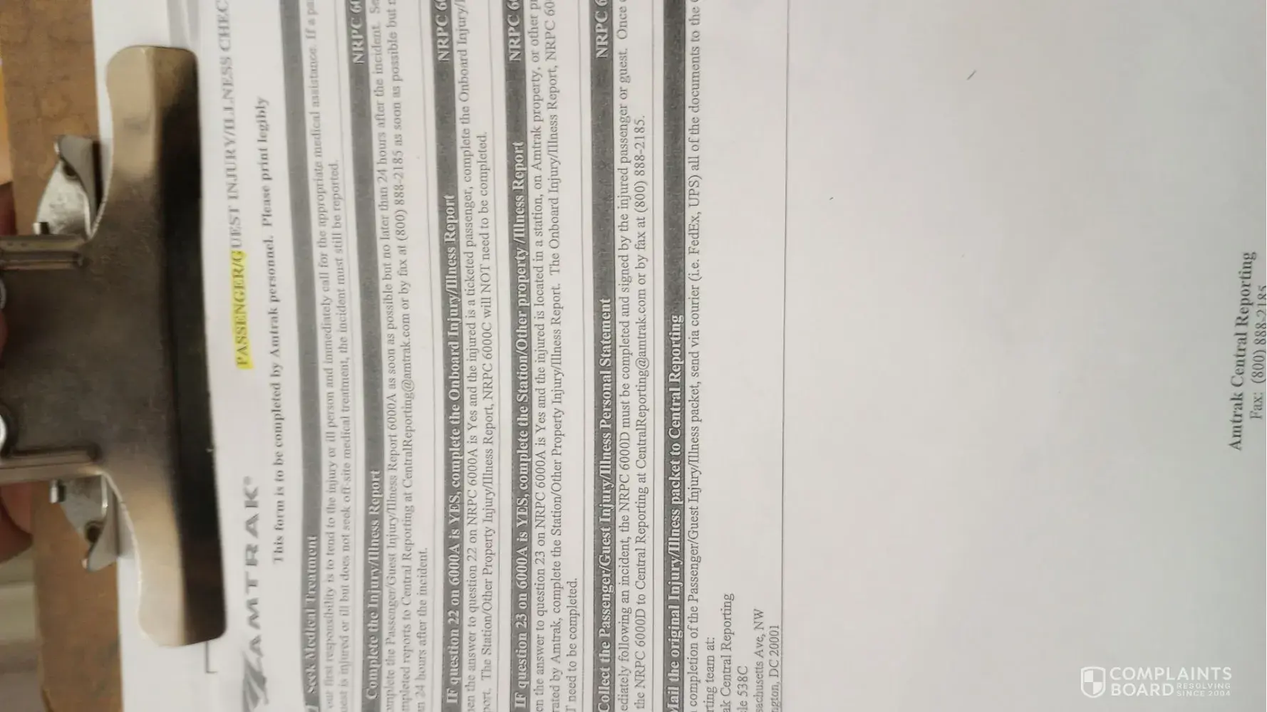 I have made several calls to the numbers listed on the checklist for Amtrak Central Reporting and Passenger Claims Unit as well as Georgia State OSHA office, American Disability Act, filed a complaint for those hazardous steps and up-loaded pictures. No one from Amtrak has returned my calls thus far. After a fun-filled vacation with family and friends celebrating graduations, birthdays and a lovely Mother's Day in the state of Georgia, I am now having to ware a boot, walk with crutches, clean and bandage a knee gash, soak both bruised hands, take pain meds often and take muscle relaxers for back spasms.