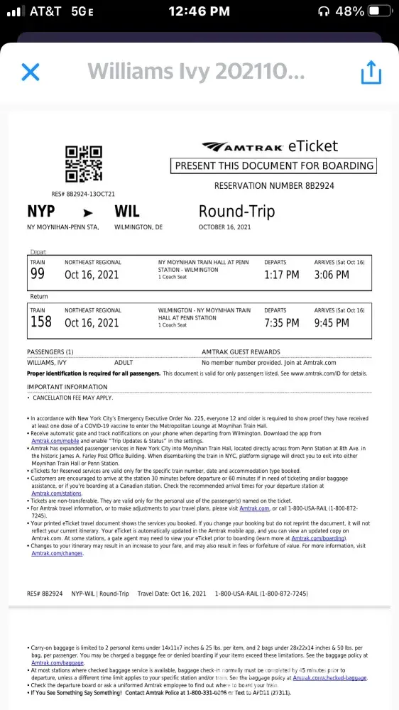 I was a passenger on train #65 @ 10:22 pm from Providence R. I. to Thurgood Marshall BWI on August 7 2021. Resv. #123743