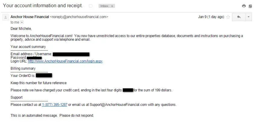 I spoke with a Guy. I explained to him that I was looking for a home in the area of Ventura Sherman Oaks .He explained to me that there were 250 listings within. After paying the 199$ dollars I was able to use their search engine. Also they stated to send as many letters as possible to owners of homes in forclosure from their listings. They said they would refund my money if I show written proof of 5 denials from homowners. The catch or problem is that no homeowners even respond at all...and they want me to go and nock on their doors to ask them for denial letters..! I sent 30 letters with no response. I want a full refund for the blatant lie about 250 houses in that area... This guy lied and deceived me to get a payment. This is the worst kind of scam possible because it preys on weak homeless people's money that simply want to gain some stability for their children. Anchor House Financial - Unethical behaviour - stay-away...