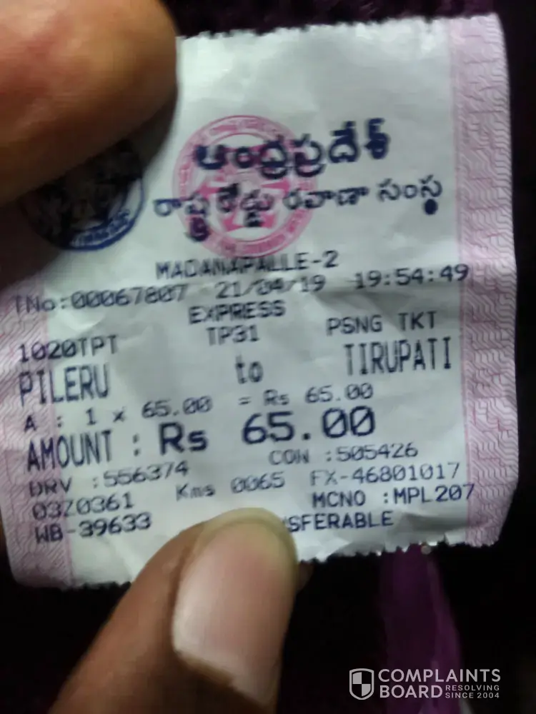 Hello sir, I'm N.Bhanu vardhan, a student pursuing engineering, i am traveling in a bus related to the depot of madanapalli 2 . I've asked conductor to give me the ticket to Vidyanikethan college, but he has charged me with Tirupati ticket. When i asked him he said that after rangampeta all comes under Tirupati, but i know that there is mangapuram after rangampeta for which the fare is 45 rupees. Is it fair to charge me with an extra fare of 20-25 rupees? Hoping for your immediate action