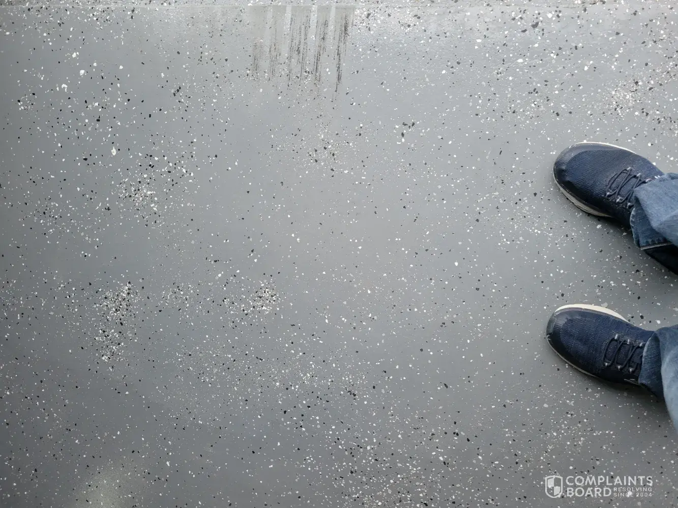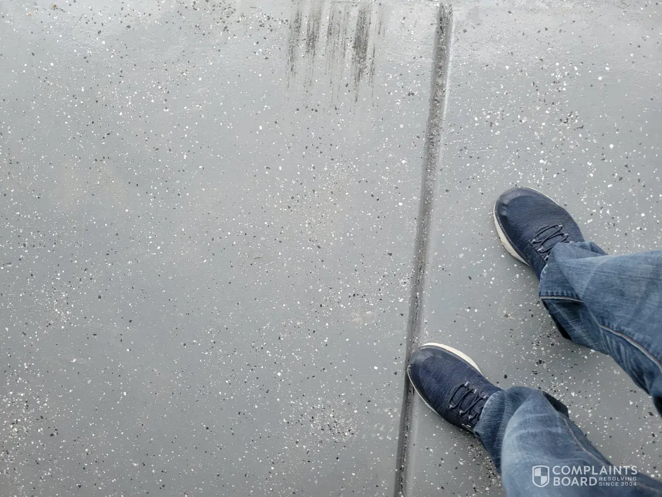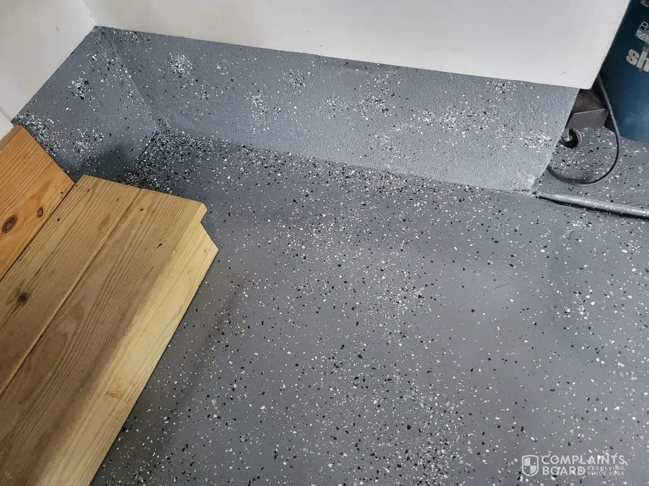The finish is very uneven, the flaking is clumpy, uneven and looks like a child did it. There are stop marks in the finish, there should be a clear topcoat on top of the flakes and that was not done. The finish was supposed to be a commercial grade, to hold up to things being moved around in a garage as well as my truck going in and out. The finish is scratching and already showing wear and it's only been a couple of weeks. You can see the tire wear, were my truck goes in and out. You can see the cracks in the concrete that were supposed to be filled and covered, not visible after the application was complete.