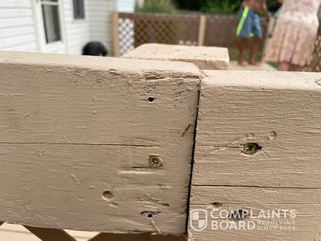 Construction and craftmanship of rebuilt areas is substandard. Joints are not even, some were not even screwed down properly. Surfaces are not level and square. Steps were smaller than normal width, not covering the entire gate area. The steps are not level and they are small. The gate is poorly installed and designed. Due to poor installation, the gate fell off after one use. Exterior paint sealer poorly applied and many areas remain uncoated. It is questionable if two coats were applied to the entire deck surface.