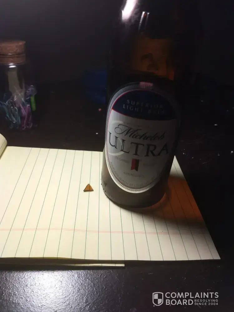 I was enjoying a michelob ultra and at the last sip felt something go down my throat. It felt long and narrow. Dont know what it could be. But whatever it was its inside me now.