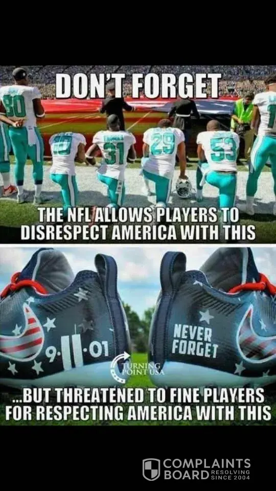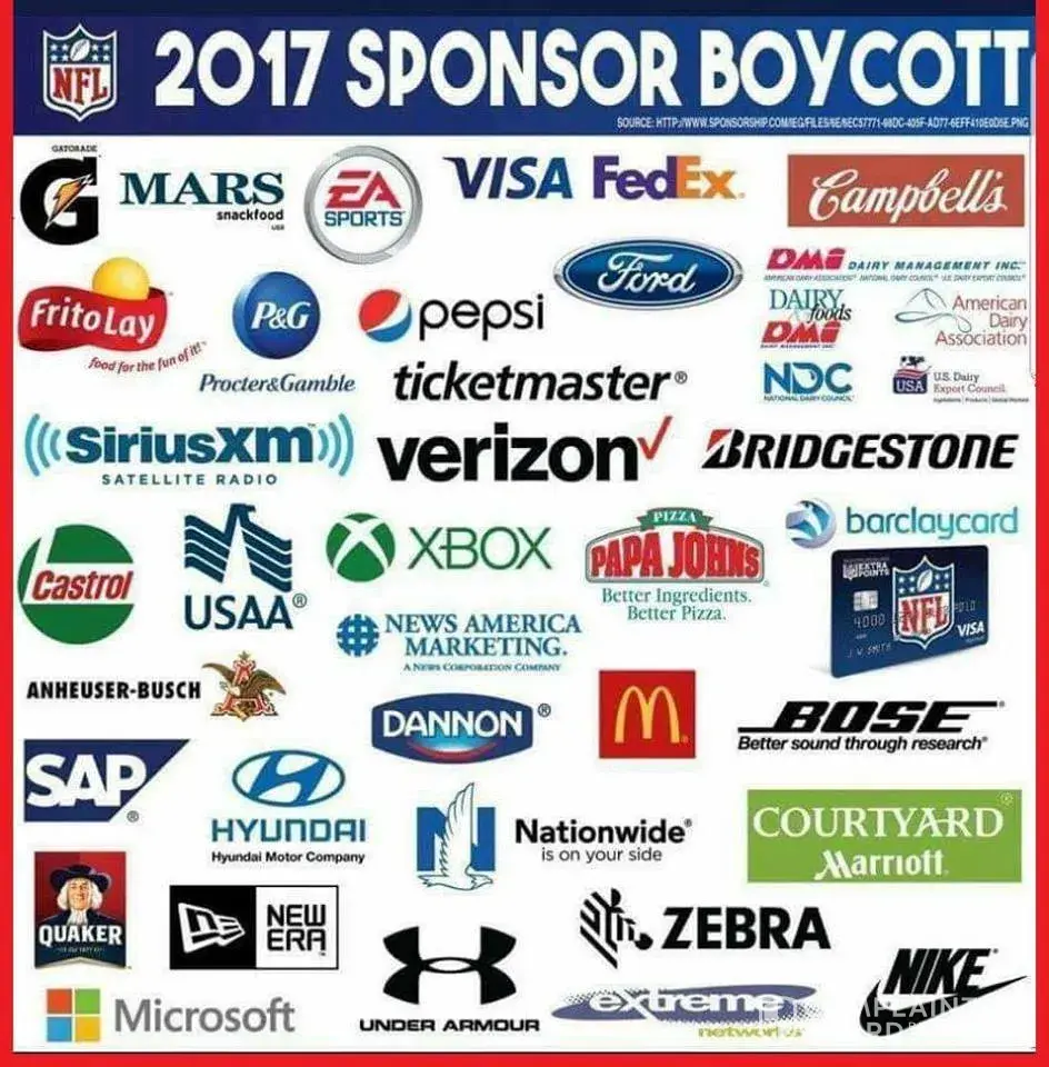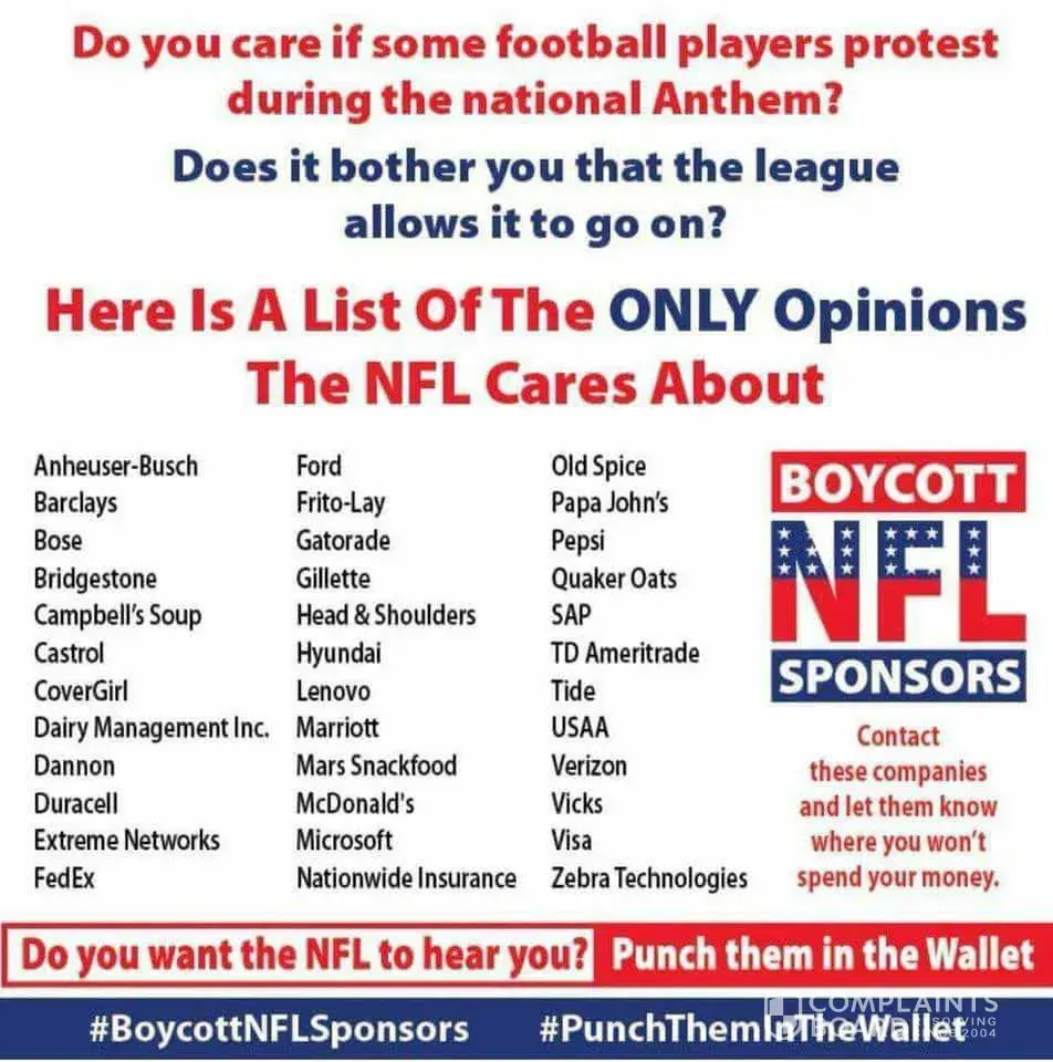 I can't sit idle and watch the NFL players disgrace our flag, our anthem, our country by kneeling during the national anthem. They have done nothing to preserve the freedoms we enjoy in this country, and never will. Instead they have taken action in an attempt to divide our country. The NFL players do not understand the consequences of their actions. But corporations will. It gives me great pleasure to see the stocks of companies that support the NFL players through sponsor ships and advertising fall in value. To do what I can to make a difference I will boycott; Comcast, Walt Disney/ESPN, CBS, Visa, Ford Motor Co., Nike Inc Anheuser-Busch, InBev, Microsoft Corp., McDonalds Corp., PepsiCo Inc. Under Armer and Bridgestone Corp. I will not be happy until the NFL fails along with the companies that support them.