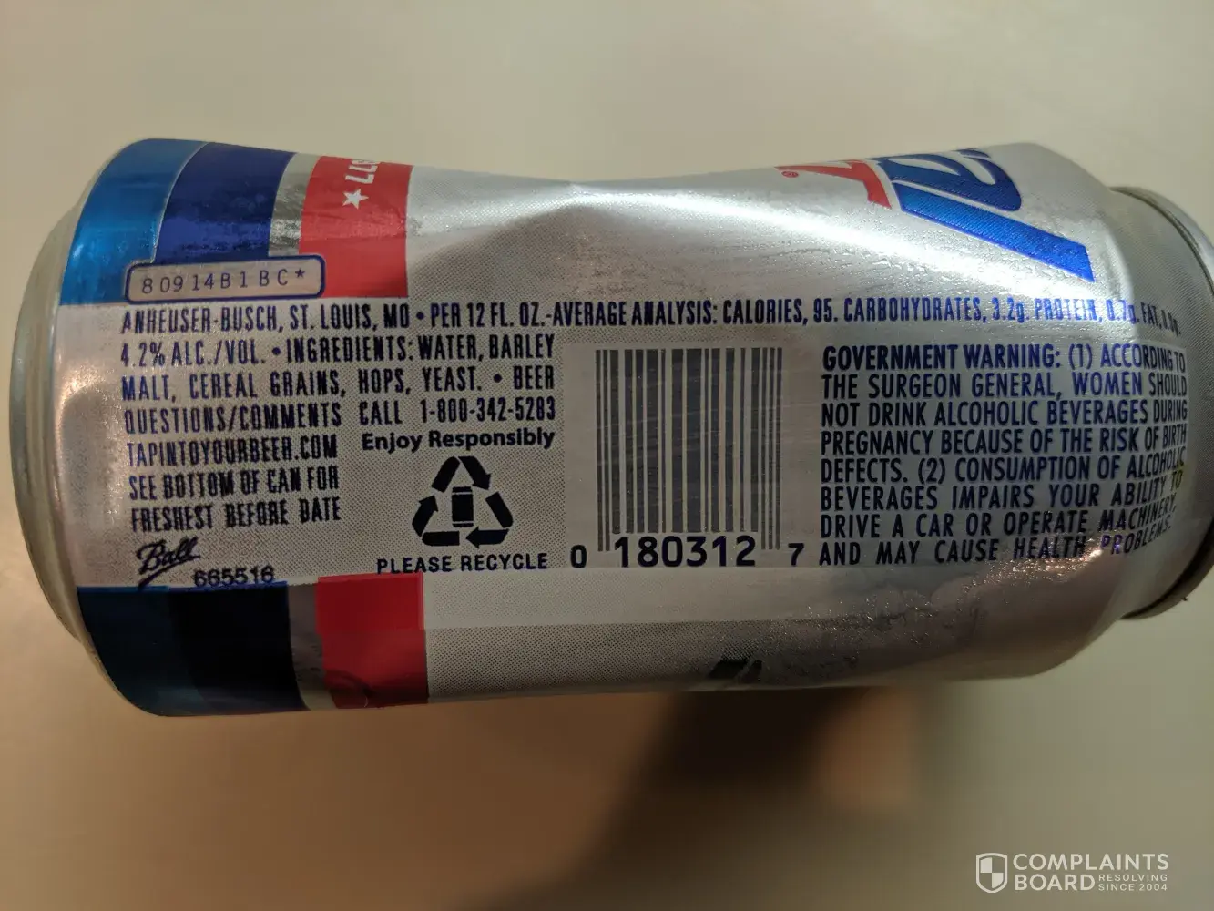 I purchased a Natural Light 30 pack from the 825 Cartersville Highway Walmart store in Rome, GA. 7/3/19. On 7/5/19, I noticed about 1/2 way through on the second level, an unopened beer had 4 sides partially sunken in as if not fully filled and sealed. I enjoy this product but am disappointed at this lack of quality. Please respond as I don't want to have this be a bad impression of quality going forward. I can provide pictures with canning information, etc.