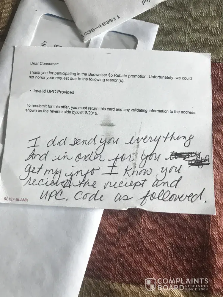 i bought a 12 pack of beer from Walgreens. I sent in the original receipt and cut the upc out to send. I couple of weeks later I get a post card telling me they can not honor my request. Due to Invalid UPC provided. That's were I knew they told a lie. If you all the information I sent in the envelope. You got correct receipt. How can you resubmit something when I sent it you. You need to honor your rebate or stop having them point blank.