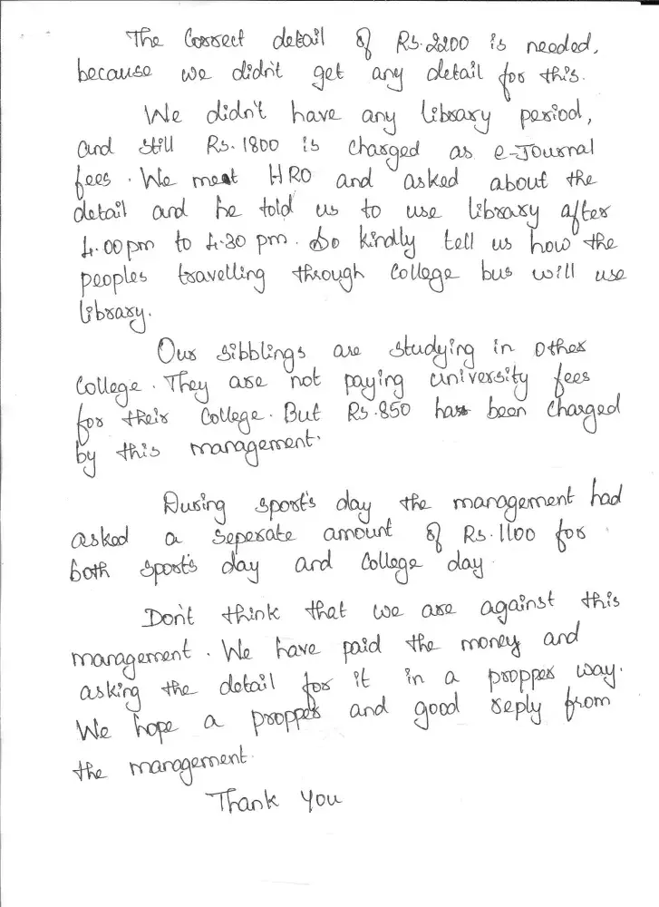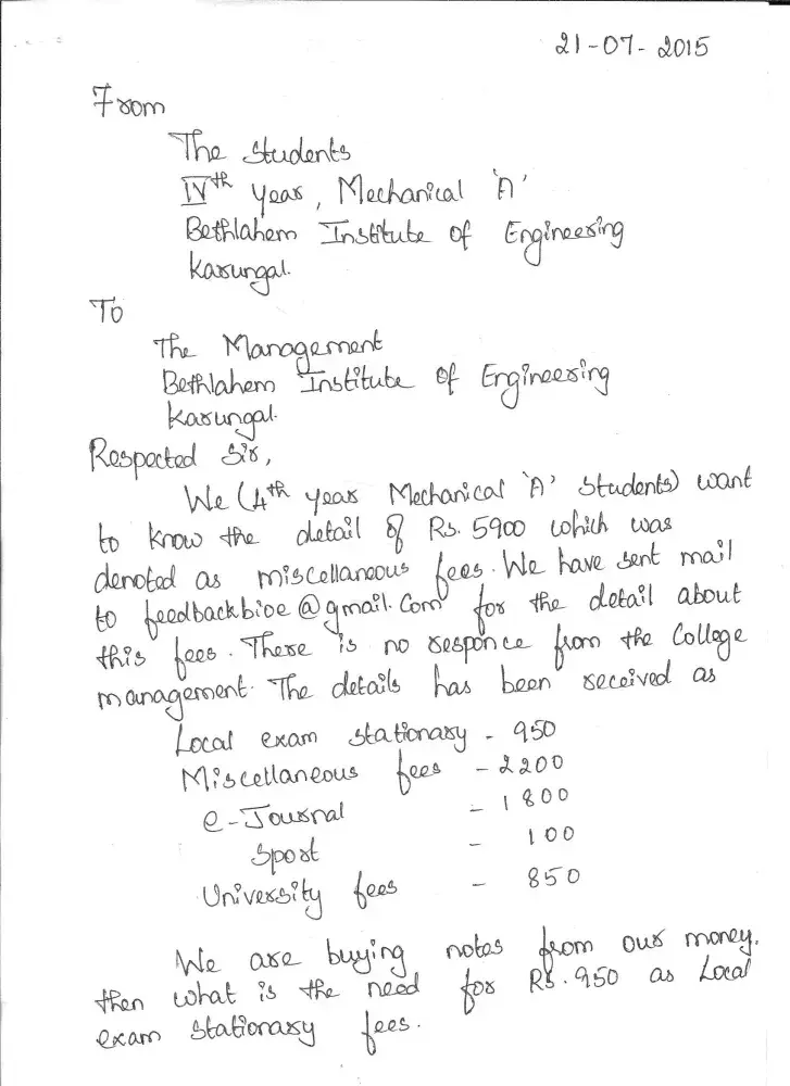 we are the student in bethlahem institute of engineering, karungal. whis is under anna university . in our college they ask 5900rs extra in our fees. we ask for the detail in the last month they dont give the detail till now. we request you to make our college to refund that money if it s possible. or give the detail for that money with correct reason.