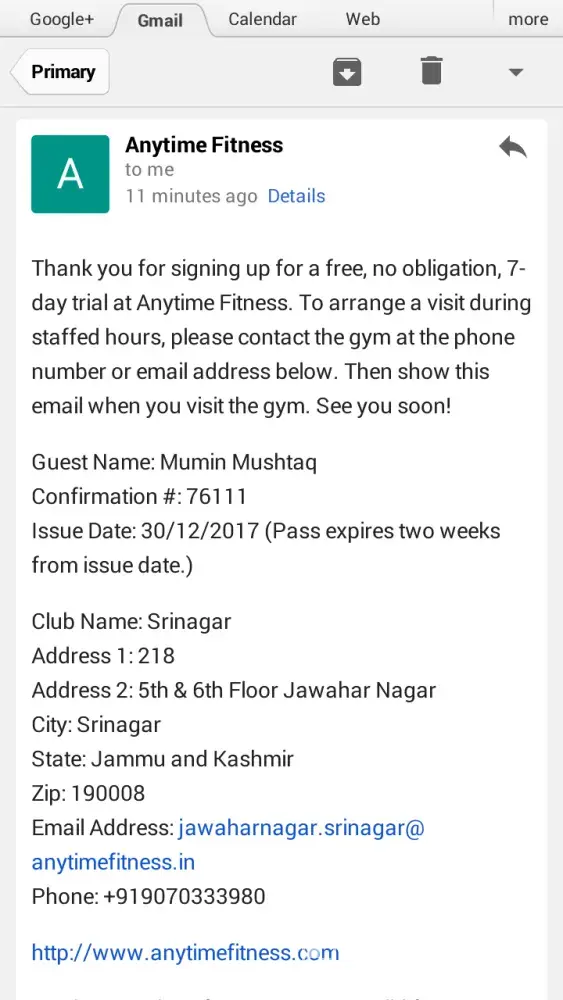 ignoring the 7 day free trial pass of anytime fitness in your branch srinagar