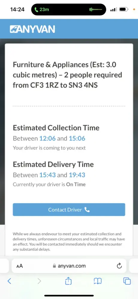 I booked a van with anyvan to help move my house items from cardiff to swindon. I pre-paid and on the specified date which is July 6th 2024, i was sent a collection time of 12 noon to 3pm and delivery time between 4pm -7pm. By 12 noon, i called the driver and he said he would be with me by 2pm. I have the housing agent and a driver waiting from 12 noon to...