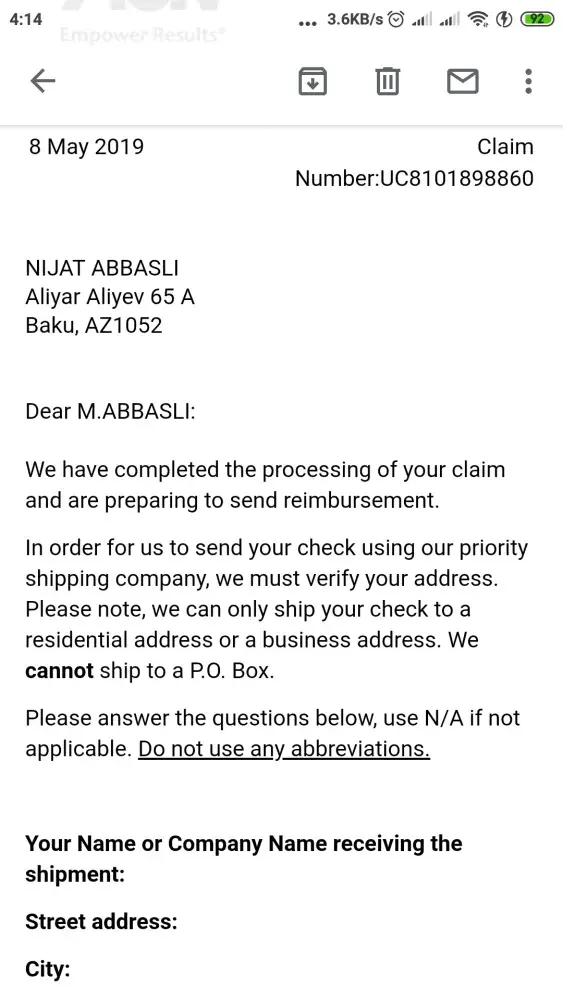 I would like to mention my deepest disappointment regarding the reimbursement service by AON. Despite my continuous emails and requests since March 2019 company is keeping to delay the refund process. The latest update was that, I have received shipment about about the check after 2 months. However, I did not receive any refund yet. This is quite disappointing. I kindly ask you to consider this matter urgently and provide refund asap to my account. In attached screenshot you can find the details I have filled based on company's request for shipping of check. Claim number is mentioned in the attached file as well.