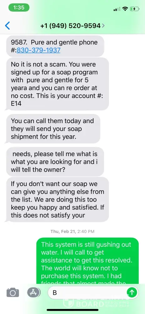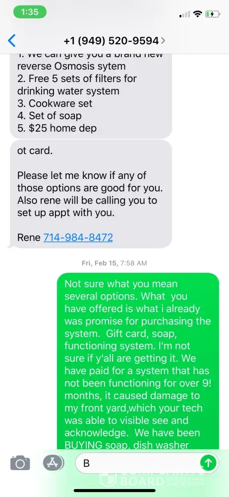 This is a company that only here to operate like a Mafia Mob. They do not care about service. Only to install water. Please do not open your door nor to call this company, ever. You will stock with a $7000.00 bill for no water softner in your house. Before i have to pay the First payment the water system doesn't work and they are not willing to fix it. That is so unhuman and no word to describe. Jeanot Charles