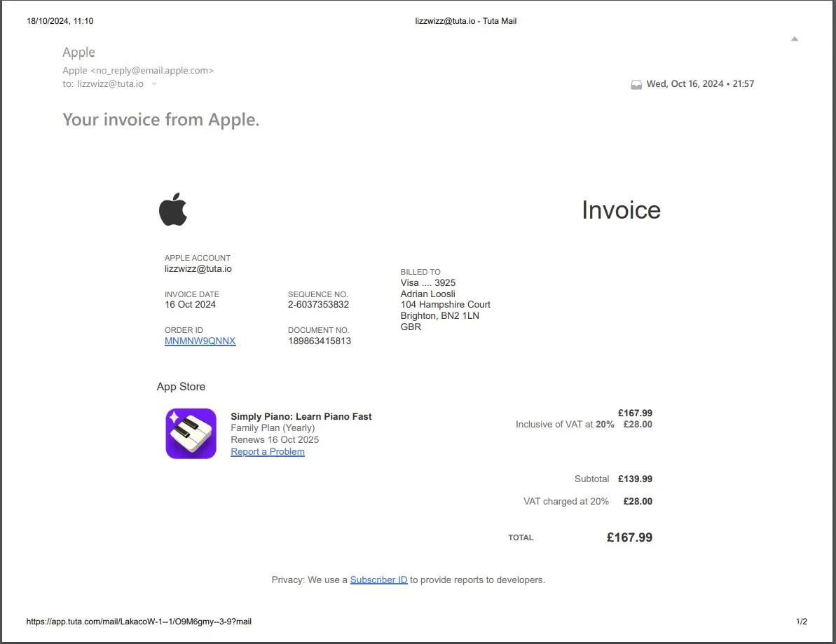 I am writing to express my frustration and concern over a charge of £167 for a Simply Piano yearly subscription that we did not intend to keep. We had signed up for the 7-day trial while waiting for login details from a family account that already provides us with access to Simply Piano. In the excitement of receiving our new digital piano, we forgot to cancel the trial before the charge was made.