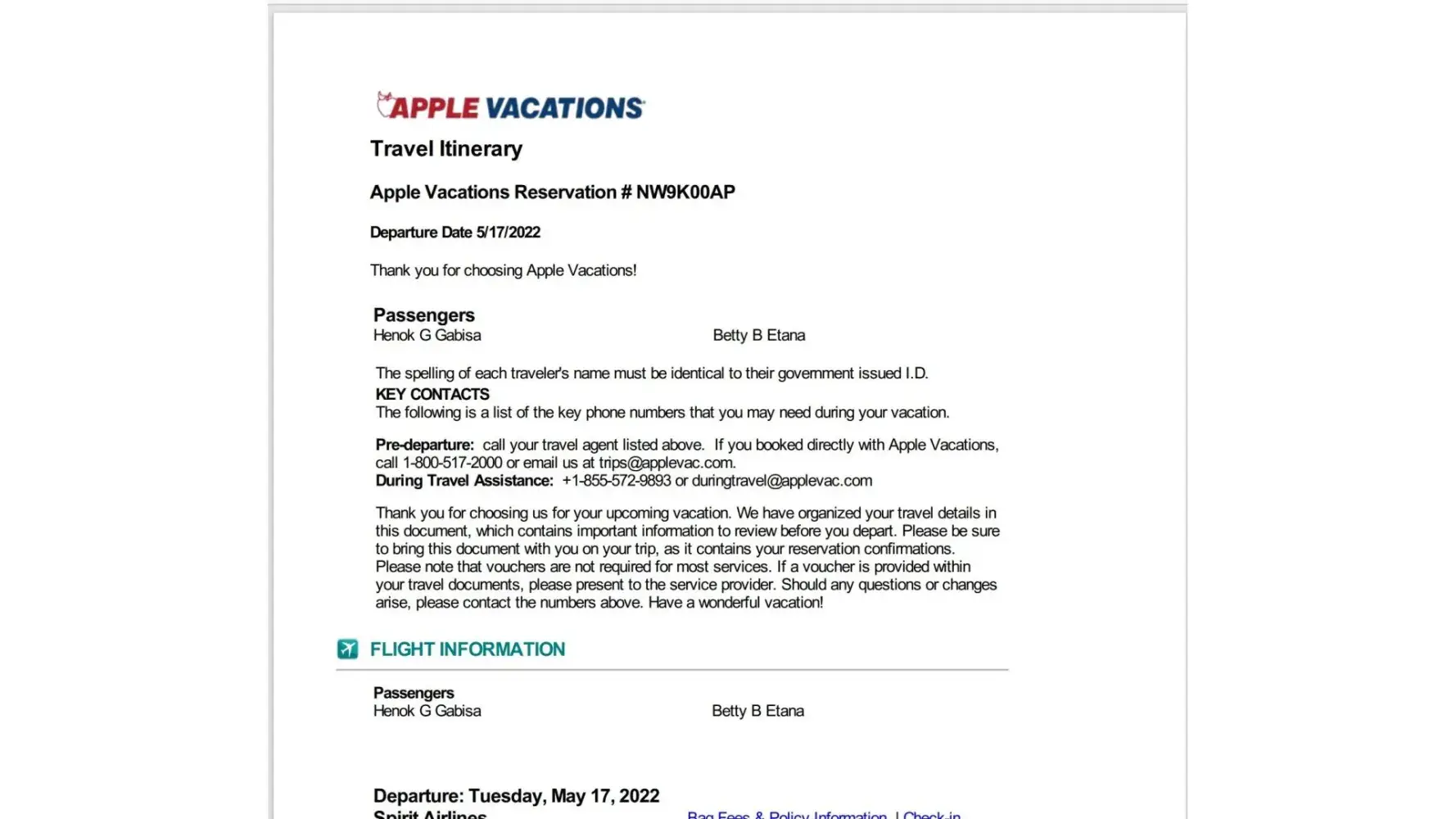 1. We bought a vacation trip from Apple vacation to travel to Jamaica on May 17,2022 and return May 22, 2022. We paid over $2,600 for the trip.