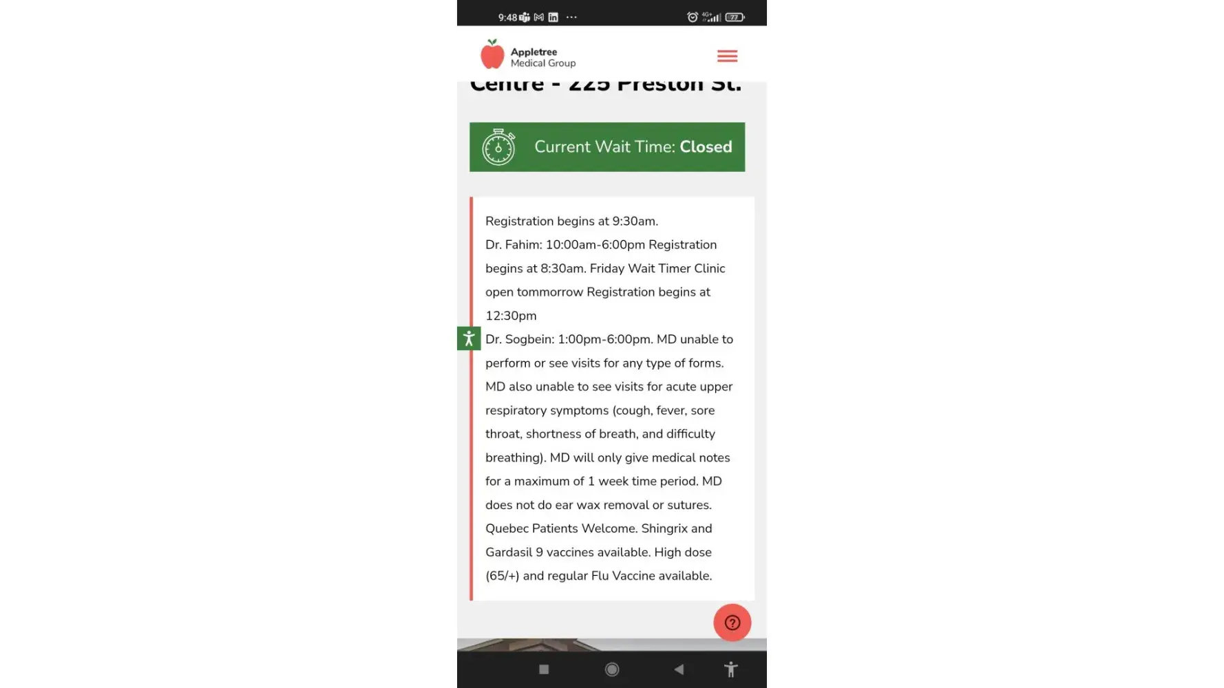 I visited the appletree walk-in clinic located at 255 Preston St Ottawa Ontario Canada, I came early so I can get a spot, I've waited over 3 hours nobody is there, then came a person working on the pharmacy and told us me and the other waiting patients that he is not sure when they open today but usually at Friday, they open at 12:30 and it depends they open on different hours each day, although it's clearly written in the appletree clinic website that the walk-in clinic opens at 8:30 on Friday, November 4,2022.
