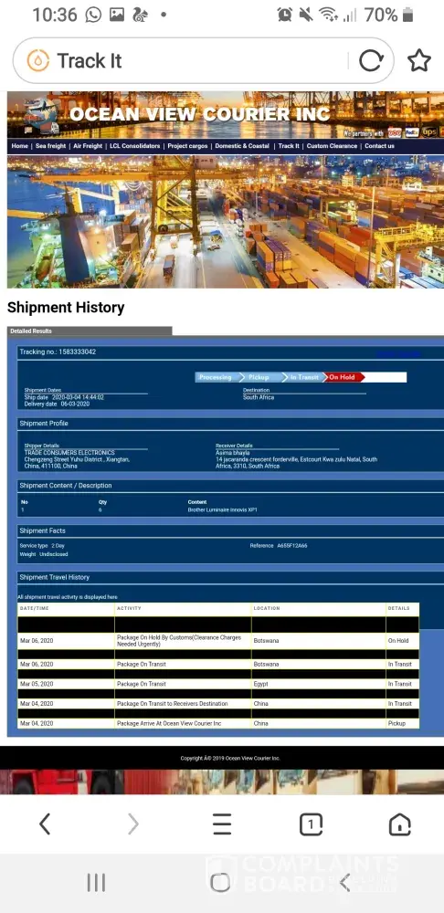 Hi I'm from south africa and I bought a sewing machine for 400 dollars with shipping via Alibaba. It was due to arrive on the 6 march 2020. I after a few days I was told by my supplier to pay 720 dollars for clearance charges then another 810 dollars refundable insurance for then 600 dollars delay charges then the courier is not licensed to deliver in South...