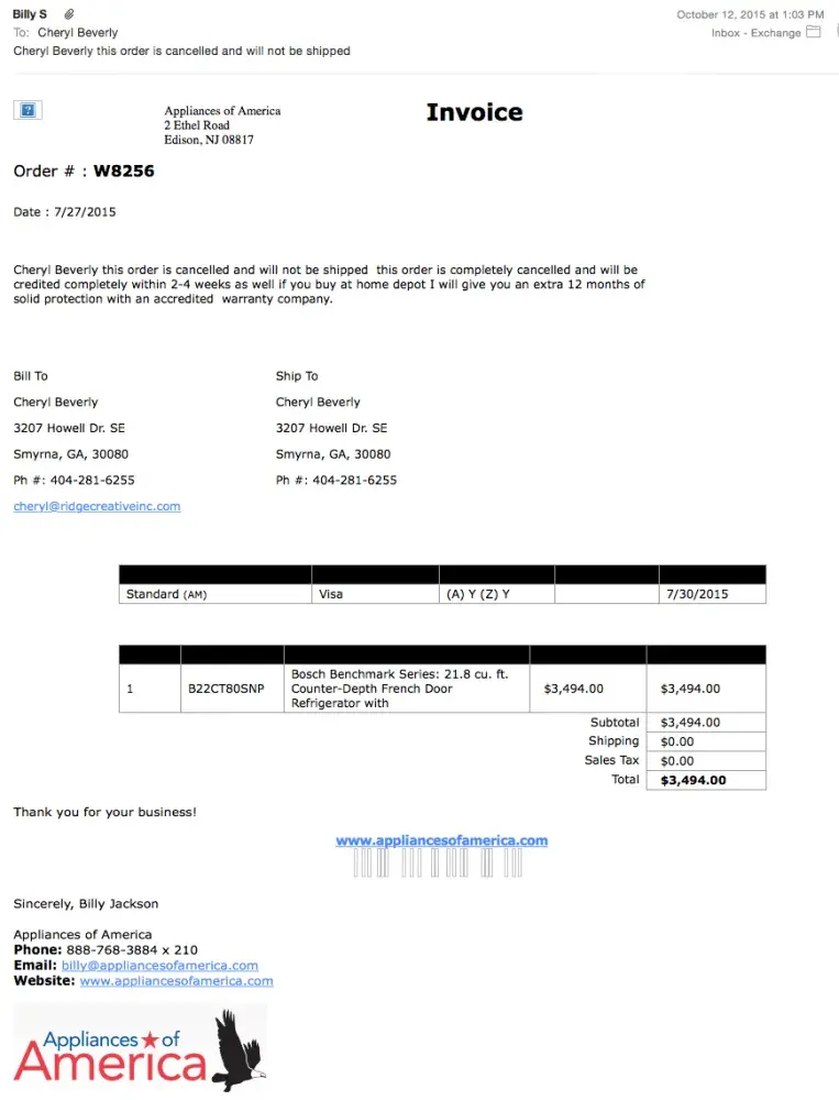 I placed an online order to Appliances of America on July 27, 2015 (Order # W8256). $3, 494.00 was immediately deducted from my banking account. It is nearly impossible to speak to anyone there. But, we have had a few correspondence with Billy S and Sean. It took them three months to let us know our item had been discontinued. We then canceled our order and was told it would take 2-4 weeks for reimbursement. It’s been nearly 4 months these people have held our money hostage. I’m quite certain this is a fraudulent operation.