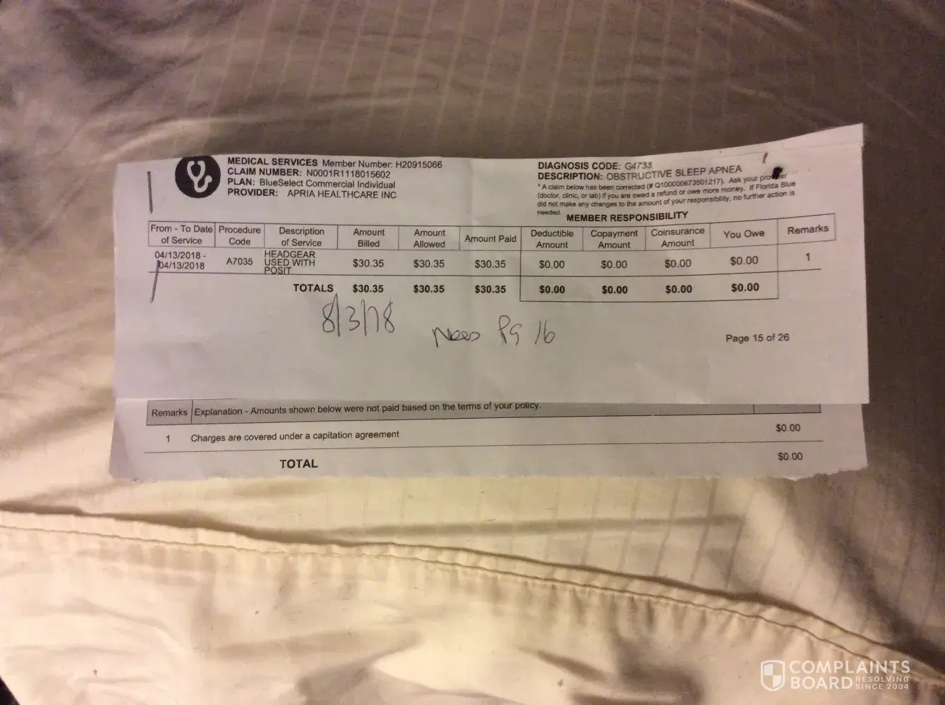 3) in my phone call to apria they were very snotty and said that blue cross had paid their portion but there was no proof in the statement. I asked for a detailed invoice and all I received 2 weeks later was an inter-office document with no detailed information.in addition the information was very confusing and hard to match up to the few packing label I did receive.