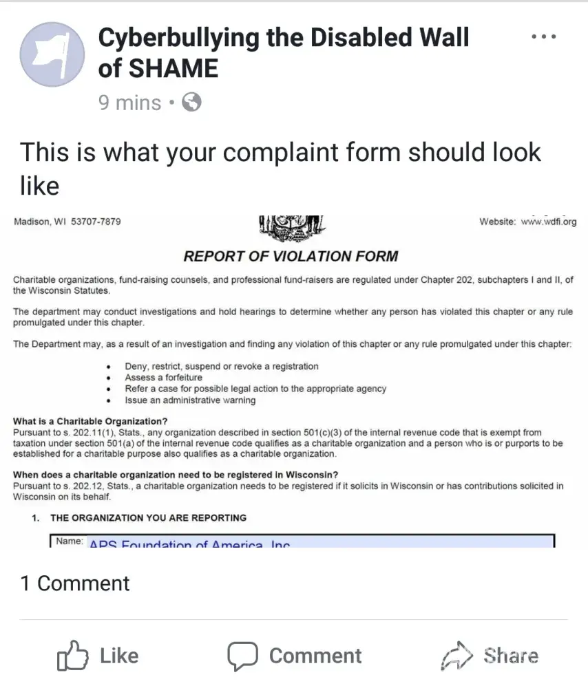 I want to report Tina Pohlman and her APSFA to the Wisconsin States Attorney. Who else has Ms. Pohlman harassed? Tina Pohlman has created a Well Documented "Cyberbullying/HATE Campaign" Against our 16 y/o daughter Candy Waters who has autism & is nonverbal ~ Below is a Blog on this disturbing matter. Thank you