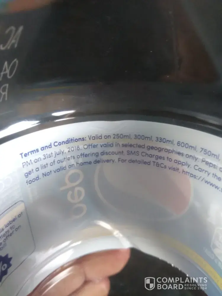 Sir, Pepsi has given an offer to have a conscision on purchasing this Pepsi bottle of 750ml offer validity is from 10 Am on 1st march 2018 to 11pm of 1st july 2018 the bottle is packed on 04.08.2018. Felt so funny to go through the offer description behind the lable... Nice management keep it up