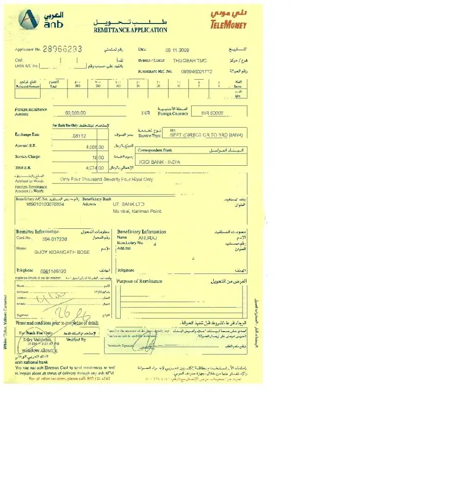 I am having a complaint about Arab Bank Telemoney service, my cousin send an amount of INR 50000/- on 06-11-09 from your bank THUQBAH TMC branch (branch code 301), but till this date after 55 days, the amount is not credited in my account, the transaction receipt is attached herewith, I send a mail to the bank and they send me a replay on 15th December 2009...