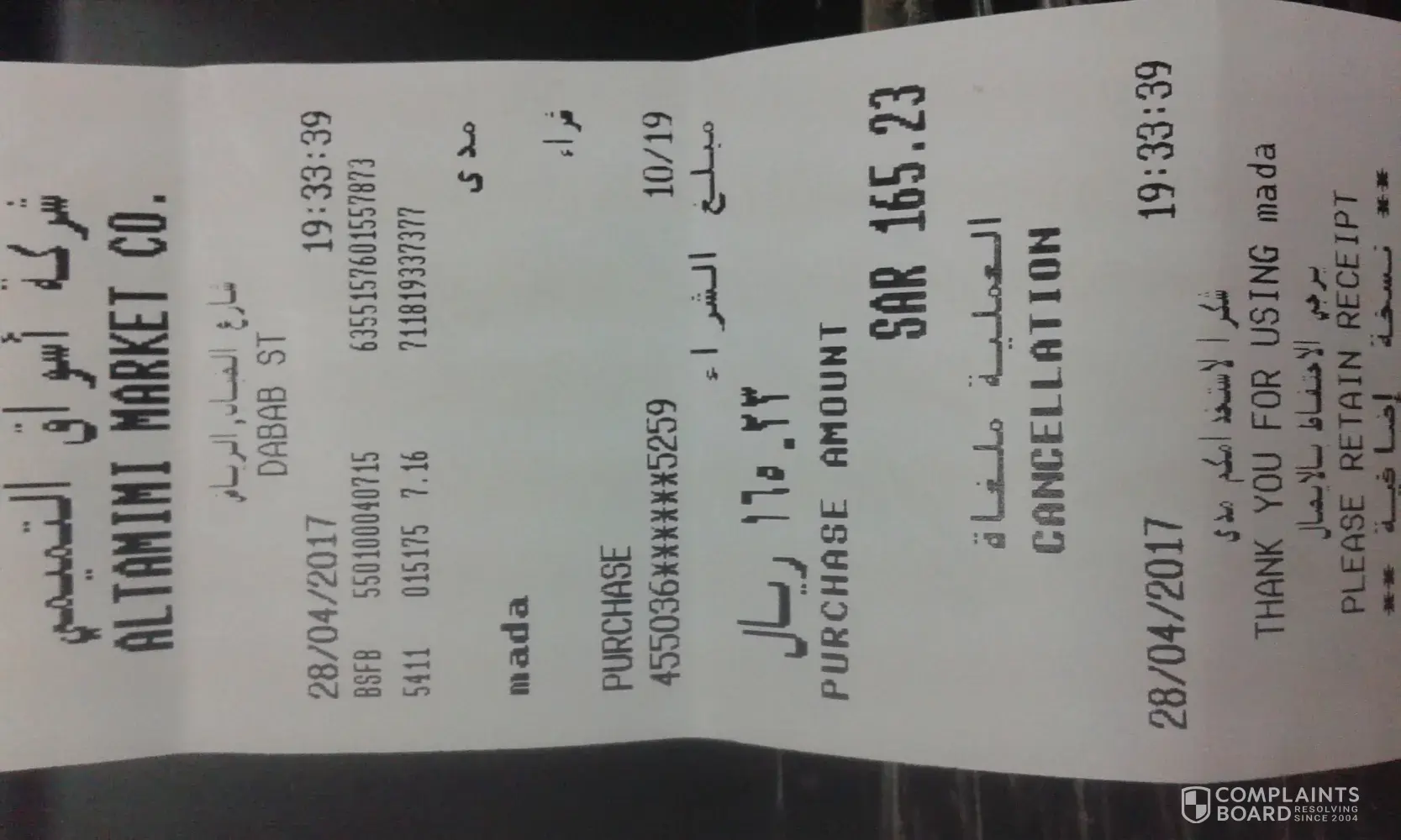 I was charged two times amount 165.23 Sr at Al Tamimi Market co, Dabab street. First time the transaction declined but still my account is debited and the second time transaction was approved, so i was charged again for the same amount.