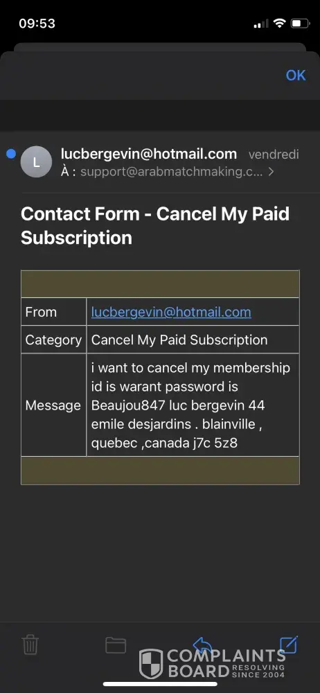 I've took a 3 month time, starting around the 12 dec more or less and it's coming to an end in March. I've tried with ccbill (credit company) with my pre-paid credit card and they couldn't not find my file, and they provide me with the addressee (e-mail) the phone number [protected] (this address is on the bottom of their pages) and still couldn't contact them where it's says contact us! It isn't working at all and when I put my name and password on the site I get in without any problem, so they have my information and I just CAN'T cancel it! I have no other mean to do soo, that is why I'm contacting u! I've never had any problem at all on other sites for cancelling except for arabematchmaking.com