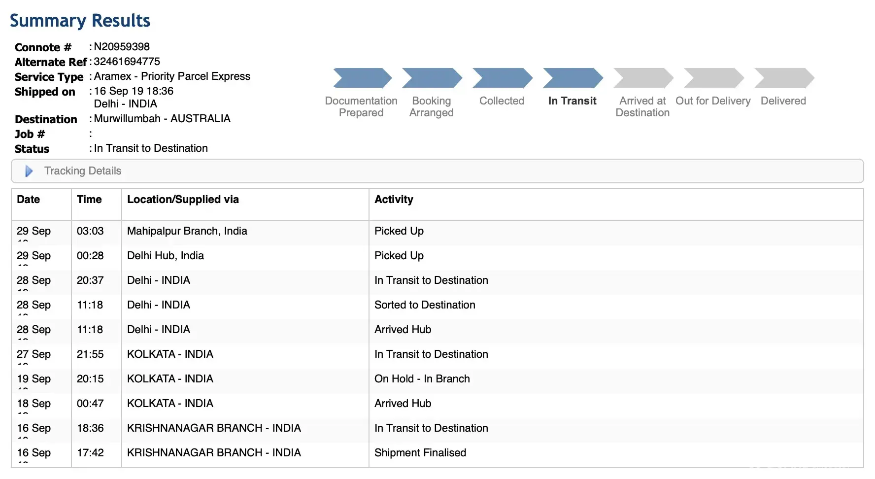 20 Sep 2019 - Shipment Arrived at Aramex Sorting Hub - In Transit / Will Keep Moving to Reach its Final Destination Country