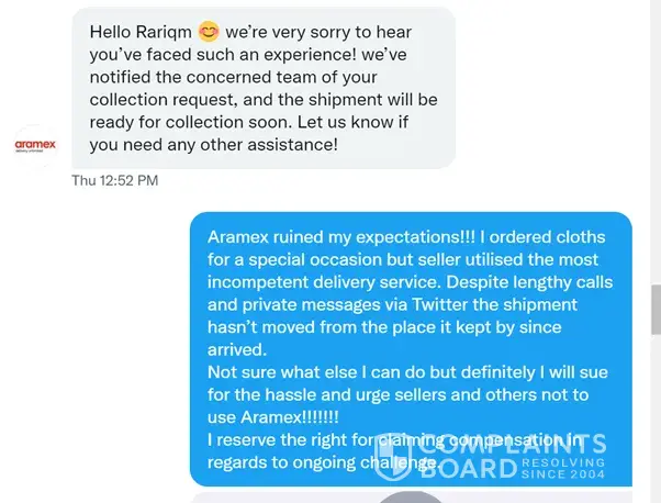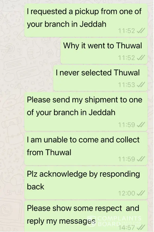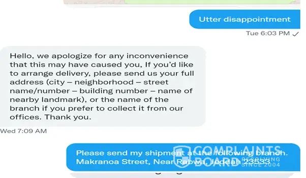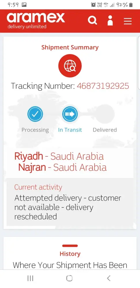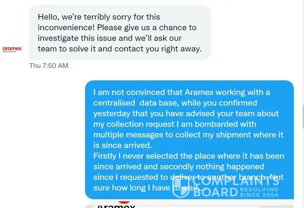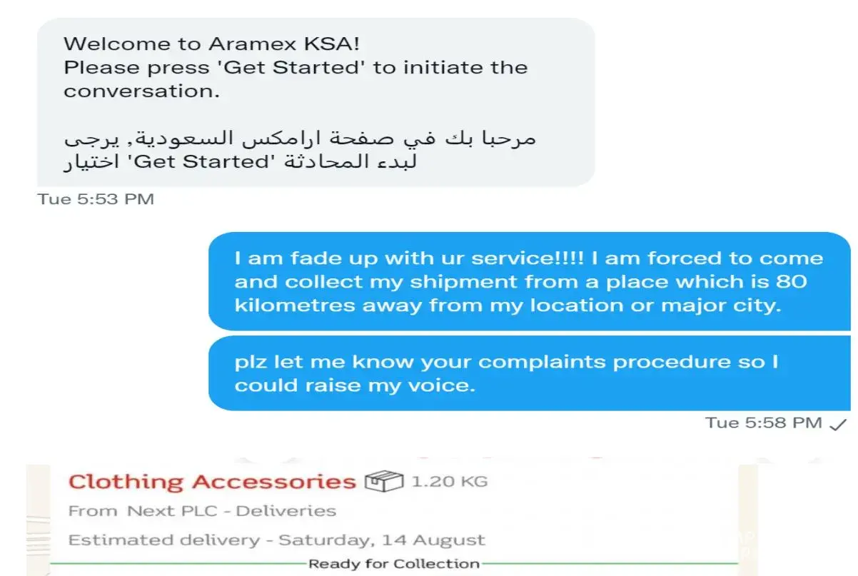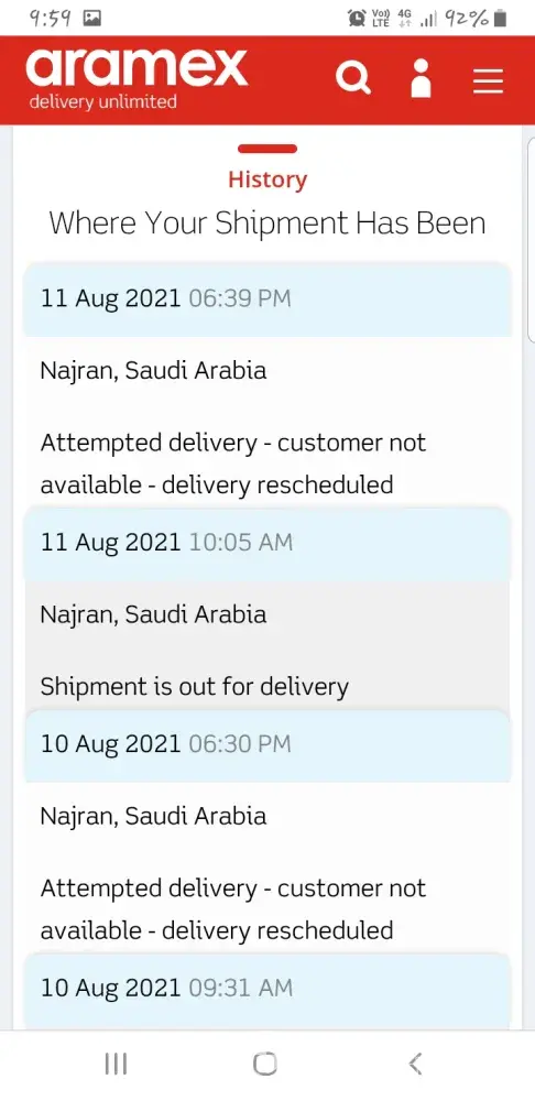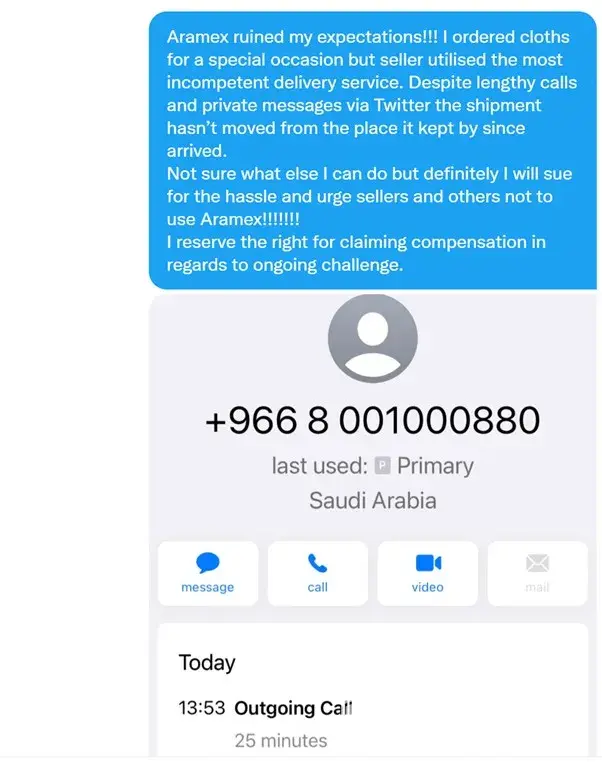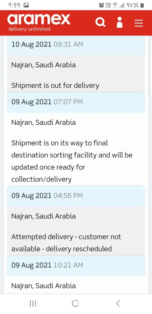I have a complaint about the aramex services here in saudi arabia delay deliver already 3days to contact me but he call and then he turn off after I answered, three time he make and I call back he make it busy my call. And i call also the customer service but he answered okay i follow up but nothing happen. I'm so very disappointed happen to me. I hope you do action happen like this your franchise. I attach the message from aramex.