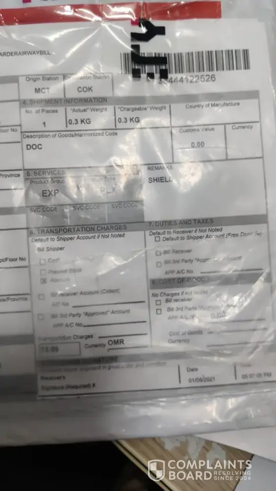 My name is Jobin m. I went to Alkhuwair Muscat branch to send an official document to Kerala, India and they gave a tracking number [protected] and i was tracking the shipment but when the person received it was empty cover. I informed this to Muscat but their response was not satisfactory! How can we trust you if you behave like this? How can i get original document? What compensations you give for my loss? Receipt and receiving condition photo is attached