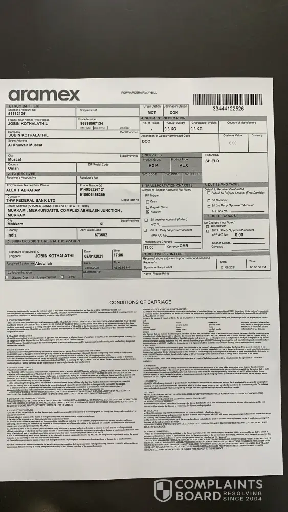 The envelope with important documents picked up from Dubai Business Bay on 16th Aug 2021 hasn't reached India as yet . It's been 10 days . I have mentioned it's Important documents . This is so unprofessional. And there is no revert on the online complaints registered multiple times on the aramex site!