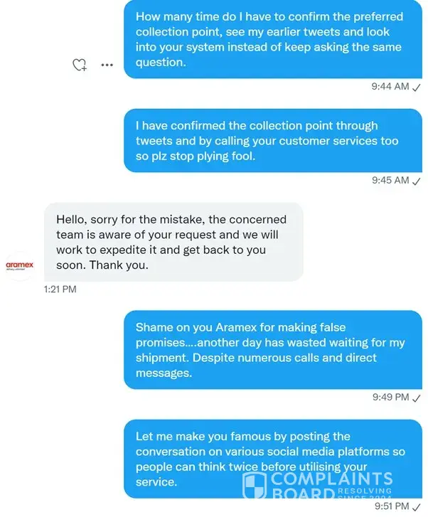 Aramex failed to deliver my shipment despite various calls and Twitter messages to their customer service representative. They kept making false promises which can be witnessed from the attached pictures. My shipment number is [protected] and I can be reached at [protected]@gmail.com