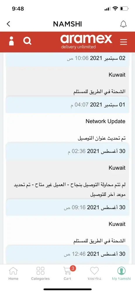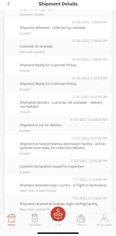 Hello. Ever since the beginning of the year, the service of Aramex in kuwait has been abysmal, as well as the offices in Tokyo Japan and Malaysia. Any shipment I order, and most of the time they are multiple shipments at a time for both locations, are always delayed by more than a month since it arrives to the origin office, until it's either delivered to me or I go and collect it. A current shipment on it way now arrived to tokyo office on the 16th of August, and was lost to the people there, and only entered my account after 2 weeks, on the first of september. That's a clear indication of abysmal work. Another shipment entered my account on the 31st of august, and till ow it didn't leave the office there, which makes me fear what kind of delay that might happen to the other 4 shipment available in my account. All of this is nothing compared to the terrible service that is happening in aramex kuwait. Their reasoning is they are locating to a new warehouse and too much work, plus problems with the customs. Why would an air shipment take upto five days to be cleared from the airport? Does sorting a shipment take up-to a whole month? Is that what we as customers should expect from you, with all the history of great service you provided us through the years? I call the service call center daily, and send requests daily inquiring about the shipments, and there is no satisfactory response from them except the inquiry has been escalated. You need better employees that. An troubleshoot the problems we are facing. They don't even respond in time to any inquiry, and don't solve any problems. I am sorry to say, but the service is crap. The operations division in kuwait is terrible and needs an overhaul. And after all that, you don't even try to appease the customers by discounts or offers or anything. You expect us to eat a dirt sandwich and just shut up and take the indignity you subject your customers to. Please do better. Other countries like egypt, people get their shipments in less than a week from shipping from origin country. Are you telling me that kuwait has more work than egypt? And COVID is really an excuse now. An example of what I am talking about is attached for your reference. See the dates and you will get what I am talking about.