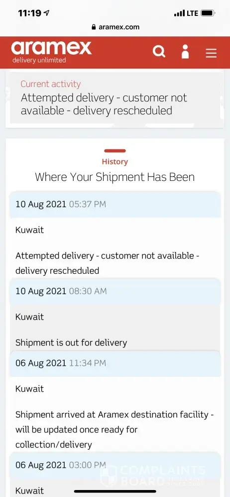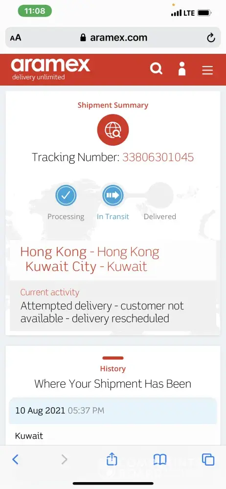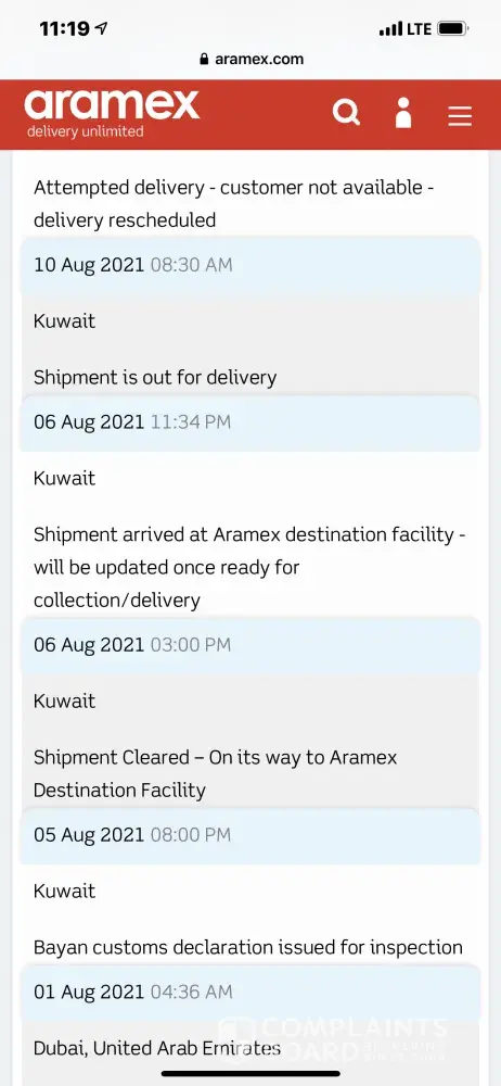 My shipment was in Aramex warehouse on August 6 and I checked the tracking system they have on the 10th they said delivery on the way but I never receive it next day I got a tracked it to but it says we contact the customer customer is not available which is a lie do you never contact me or called me I called them next day and they said they have a problem with the driver I asked the operator to talk to the managerTalk to me and she said your shipment still in the warehouse is this the way around this deal with customers please tell me thank youAnd how come shipment coming from China took about four days and in Kuwait now it's about five days to reach the customer how come thank you